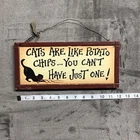 This wooden sign features a contemporary design with a wood grain pattern and a rectangular shape. It showcases the character of Ares and a theme centered around cats, making it a charming addition to any room in your home. The sign includes a wire hanger for easy display and depicts the phrase "Cats Are Like Potato Chips...You Can't Just Have One", adding a touch of humor and whimsy to your decor. Perfect for cat lovers who appreciate a touch of personality in their home.