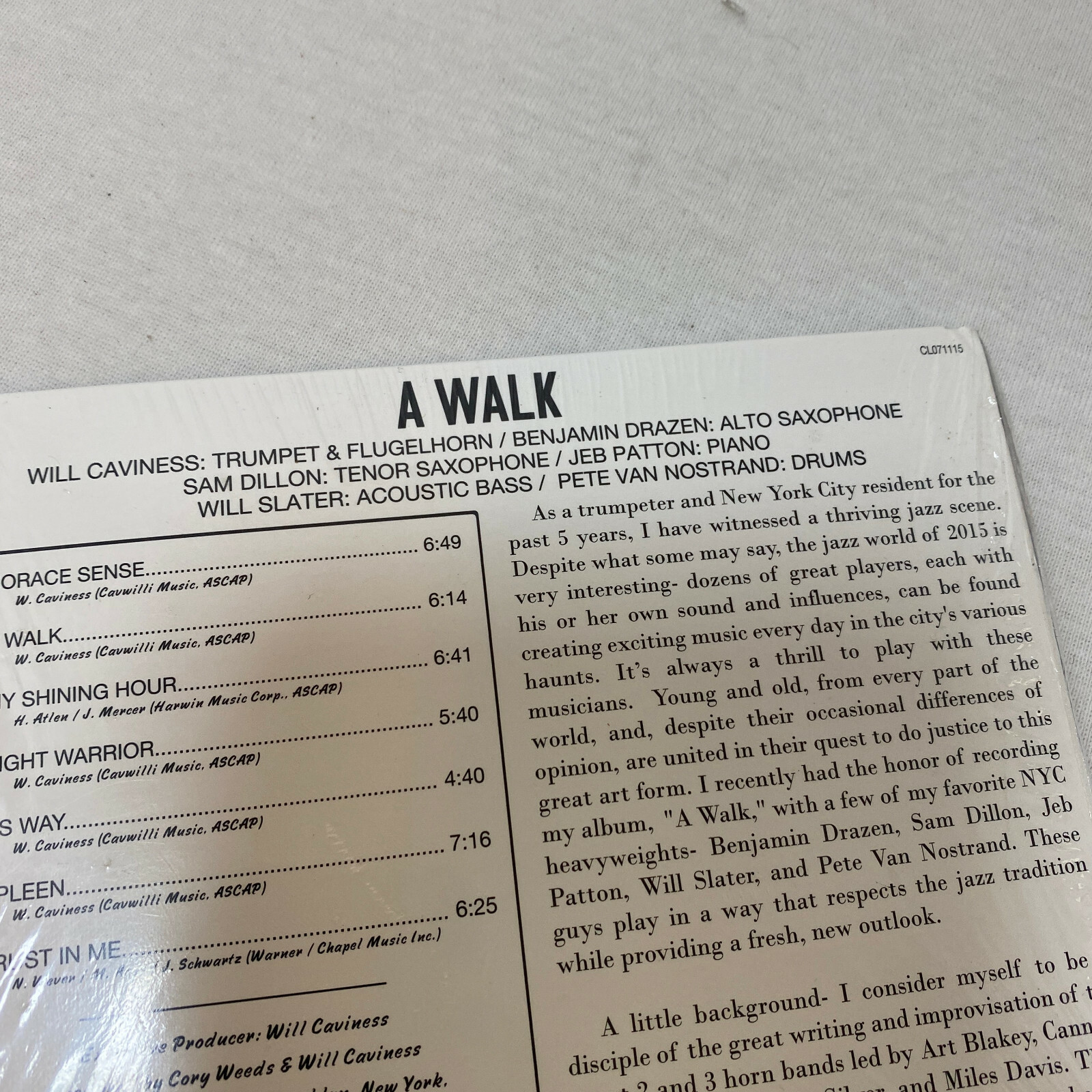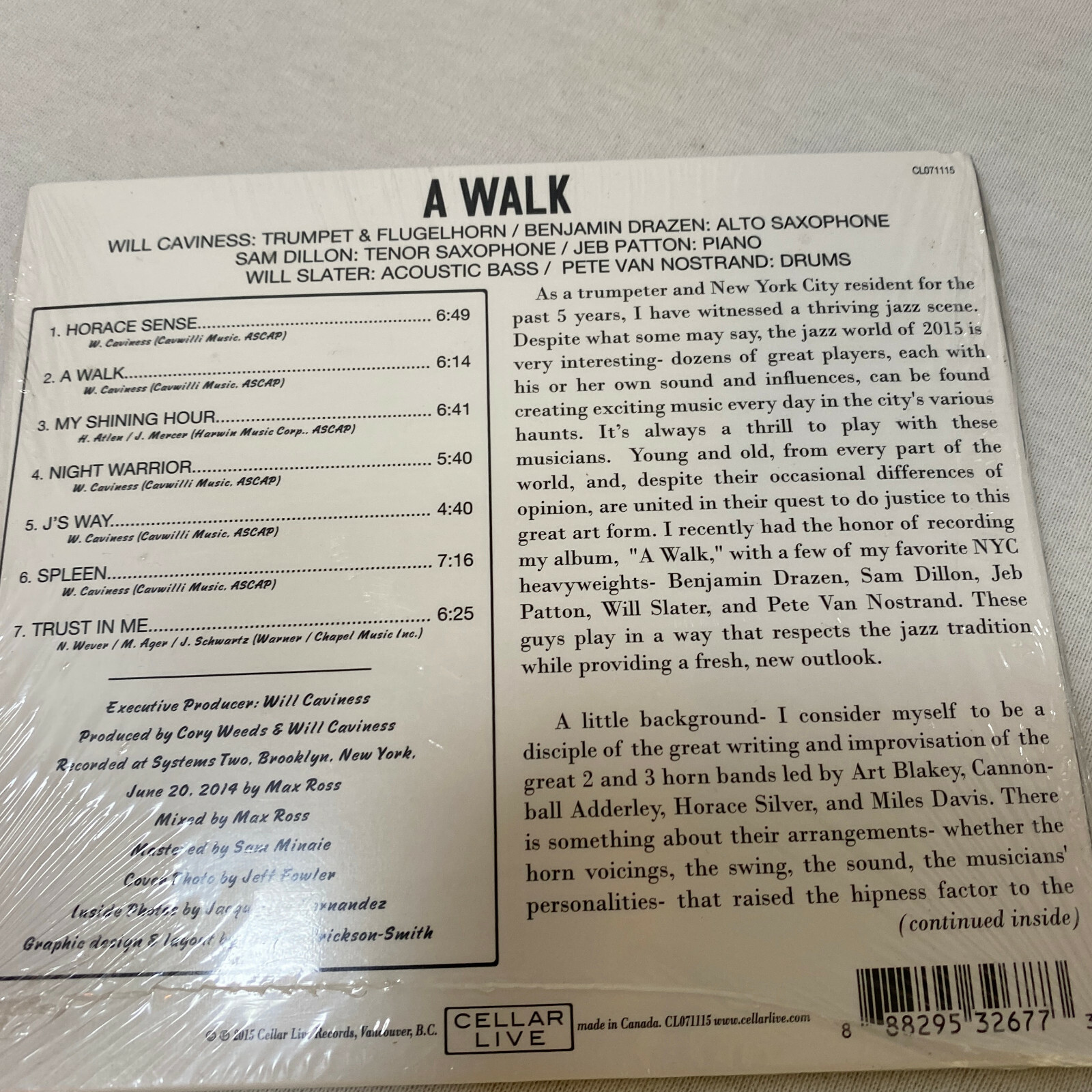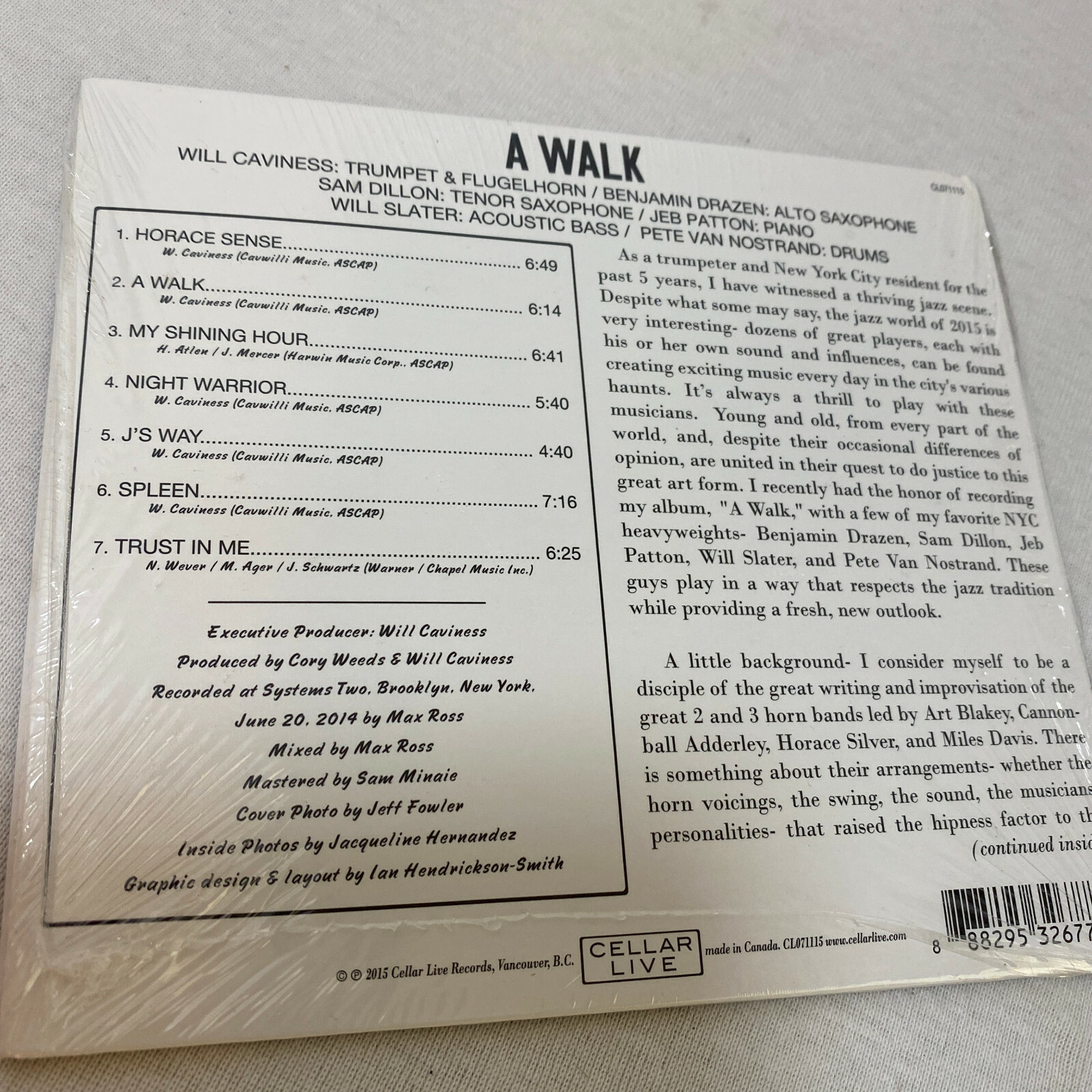 Tracks:1.1 Horace Sense 1.2 A Walk 1.3 My Shining Hour 1.4 Night Warrior 1.5 J's Way 1.6 Spleen 1.7 Trust in MeItem Height:0.15 inNumber of Tracks:7Item Length:5.46 ingtin13:0888295326773Artist:Caviness, WillItem Weight:0.07 lbRelease Year:2015Number of Discs:1Item Width:4.87 inbrand:Cellar LiveCountry/Region of Manufacture:United StatesRecord Label:Cellar Live, CelvGenre:JazzUPC:0888295326773Notes:"A Walk," the debut album of trumpeter/composer Will Caviness, is a soulful kind of record. Featuring a 3-horn-led sextet of young, yet seasoned New York players, the music is swinging, contemplative, deep, and dynamic. Mr. Caviness, a Memphis native living in New York, possesses a rich, smoky tone on both trumpet and flugelhorn that is simultaneously beautiful and edgy. Combined two saxophonists and a rhythm section, the result is a brand new take on a classic jazz instrumentation. The sextet consists of two stalwart saxophonists, Benjamin Drazen (Positone records artist) on alto and Sam Dillon (Monk competition semi-finalist and Orrin Evans Captain Black band member) on tenor; they add a fiery, blistering element to the record. Supporting the horns is a blazing New York rhythm section: Jeb Patton (Jimmy Heath sideman) on piano, Will Slater (Jerry Bergonzi, Winard Harper) and Pete Van Nostrand (Kenny Barron) on drums.Format:CDRelease Title:Walk