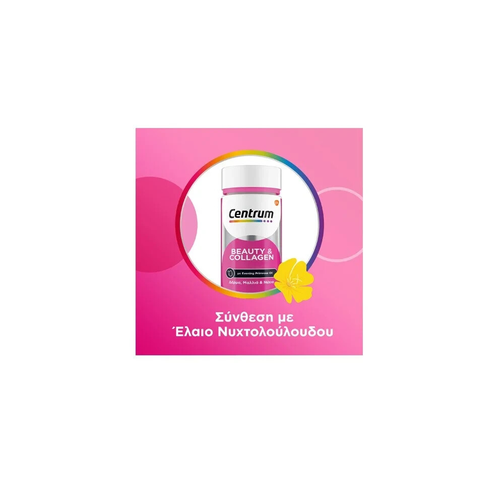 Supplement for healthy hair-skin-nails With collagen , vitamins , minerals & evening primrose oil Antioxidant action to protect against oxidative stress Suitable for adults Centrum Beauty & Collagen is a dietary supplement that supports the health of skin, hair and nails, helping to enhance natural beauty ! The soft capsules combine collagen, vitamins, minerals and evening primrose oil, offering comprehensive care. What does the dietary supplement offer? Enhances skin elasticity and radiance Reduces hair loss and strengthens hair strength Strengthens structure and reduces breakage Fights oxidative stress , contributing to the delay of cellular aging Active ingredients Vitamin A, biotin and zinc: Contribute to maintaining skin health and enhancing natural radiance * Zinc and selenium: Support nail health , enhancing their strength and durability * Biotin, zinc and selenium: Promote hair health , reducing hair loss and enhancing its strength * Vitamins A, C, E, zinc and selenium: Provide strong antioxidant action , protecting cells from oxidative stress that accelerates the aging process * Collagen: Strengthens skin structure, providing elasticity and firmness * Evening Primrose Oil: Supports skin health , hydrating and reducing inflammation** *The above are official health claims from the European Food Safety Authority (EFSA). **The above information regarding the product ingredients is the result of studies. It does not constitute an opinion of EFSA. DOSAGE: 1 capsule per day. To be taken with water and preferably with a meal. Daily Dose: 1 capsule Servings per Package: 30 Content per Serving % SEP* Vitamin A 160 mcg 20 Biotin 50 mcg 100 Vitamin E 12 mg 100 Vitamin C 80 mg 100 Zinc 5 mg 50 Selenium 55 mcg 100 Evening primrose oil 606 mg - of which GLA 54 mg - Hydrolyzed collagen 100 mg - * % Recommended Daily Intake