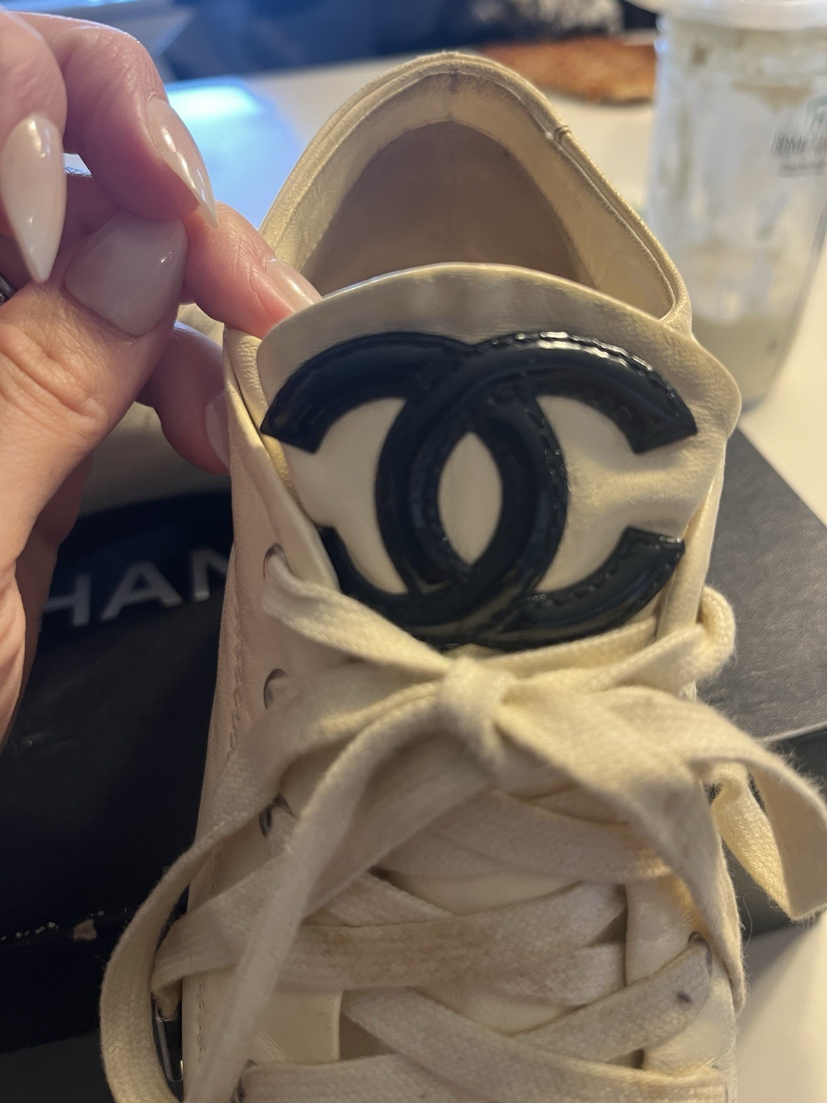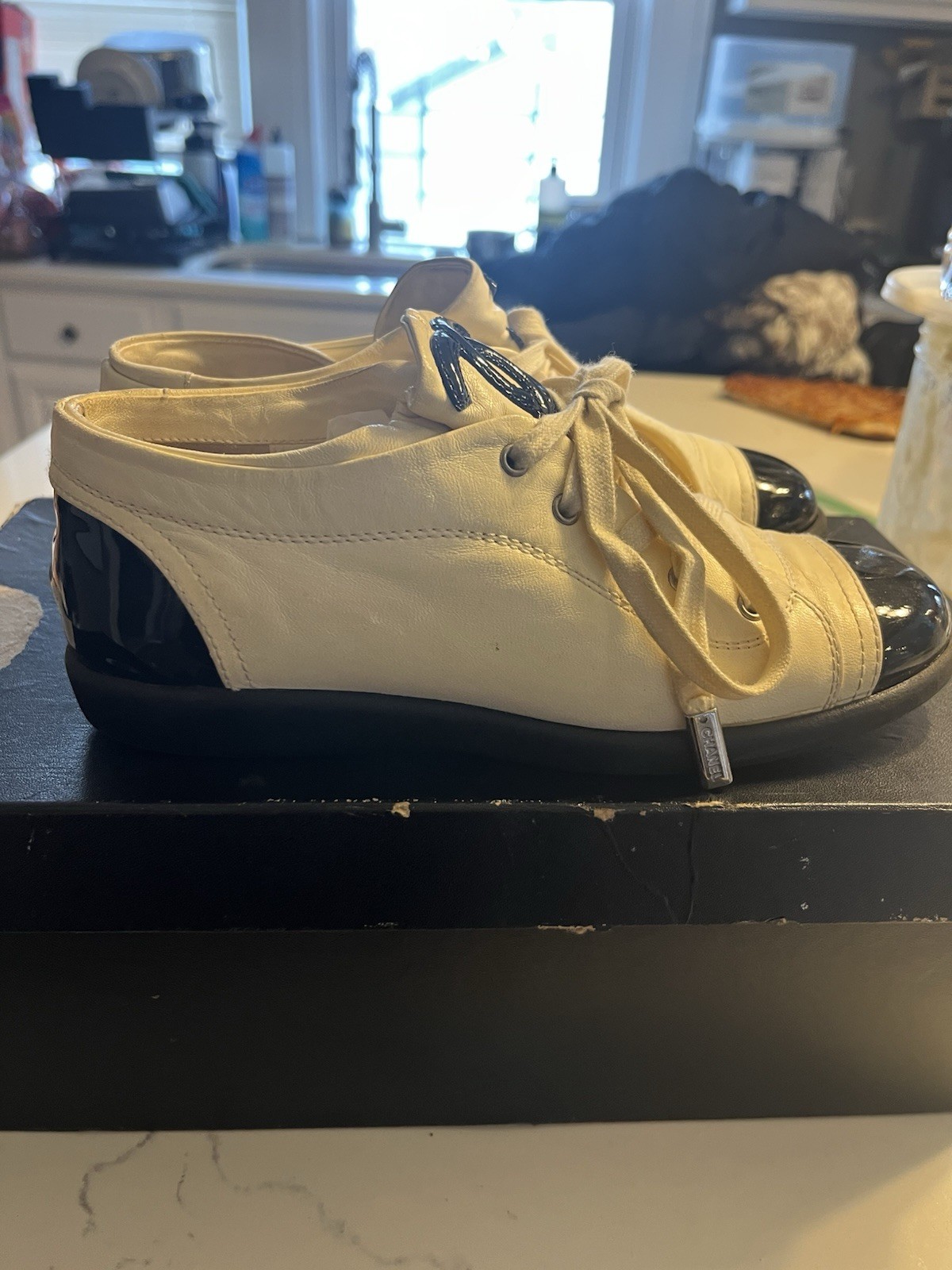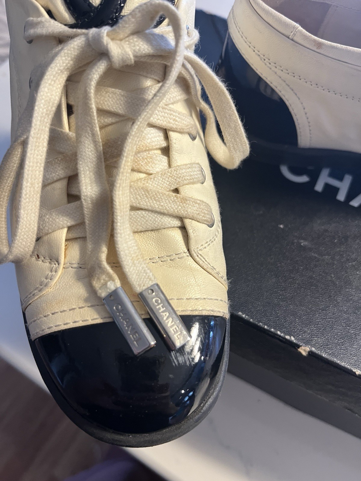 The shoes need to be cleaned, I recommend taking them to a shoe cleaner. The leather isn't in good condition otherwise, again just needs a cleaning. The laces as well. Naturally loses color overtime.