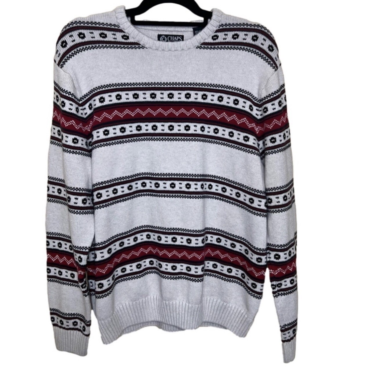 Chaps Logan Christmas Sweater Men’s L Heavy Red Cream Pattern Pullover Crew Neck Sweater is in good pre-owned condition. No defects or stains. Smoke free and pet free home. 100% cotton material. Pit-20.5”, length-26”, and sleeve-25”. We list new stuff everyday! Feel free to send offers anytime! Please review all pictures and ask any questions you’d like before purchasing! Shipping next business day! Get ready for the holidays with this Chaps Logan sweater. This multicolor, geometric-patterned sweater features a crew neckline, long sleeves, and a tight-knit style. 103-5