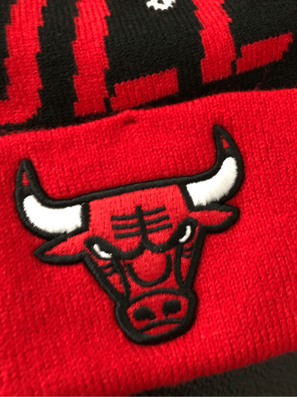 NBA Chicago Bulls Knit Pom Cuff Beanie One Size New with tags Color: Red/ Black/ White Knit cuff Pom beanie One size Embroidered Bulls logo on front Knitted Chicago Bulls on front