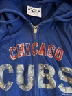 This pre-owned Chicago Cubs short sleeve hoody features bedazzled lettering, a full zip closure, and a hood. Sized medium, it offers a regular fit for unisex adults. Ideal for baseball fans, it includes pockets and is suitable for all seasons, making it perfect for gym activities and outdoor sports in winter, fall, and spring.