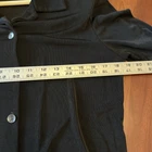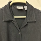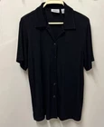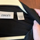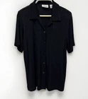 Chicos Tunic Shirt 1 Black Button Front Acetate Knit Shoulder Pads Slinky VTG Elevate your wardrobe with this stunning Chico's tunic shirt. The black shirt features a collared neckline and a button closure, making it perfect for a variety of occasions such as travel, parties, casual wear, and business meetings. The shirt is made from a comfortable and durable knit fabric that is easy to care for and machine washable. The shirt's classic and fitted sleeves, along with the slit and shoulder pads features, provide a flattering and comfortable fit for any season. The shirt's solid pattern and colorful theme make it a versatile addition to any outfit. This shirt is a must-have for any fashion-forward woman who wants to look stylish and feel comfortable.