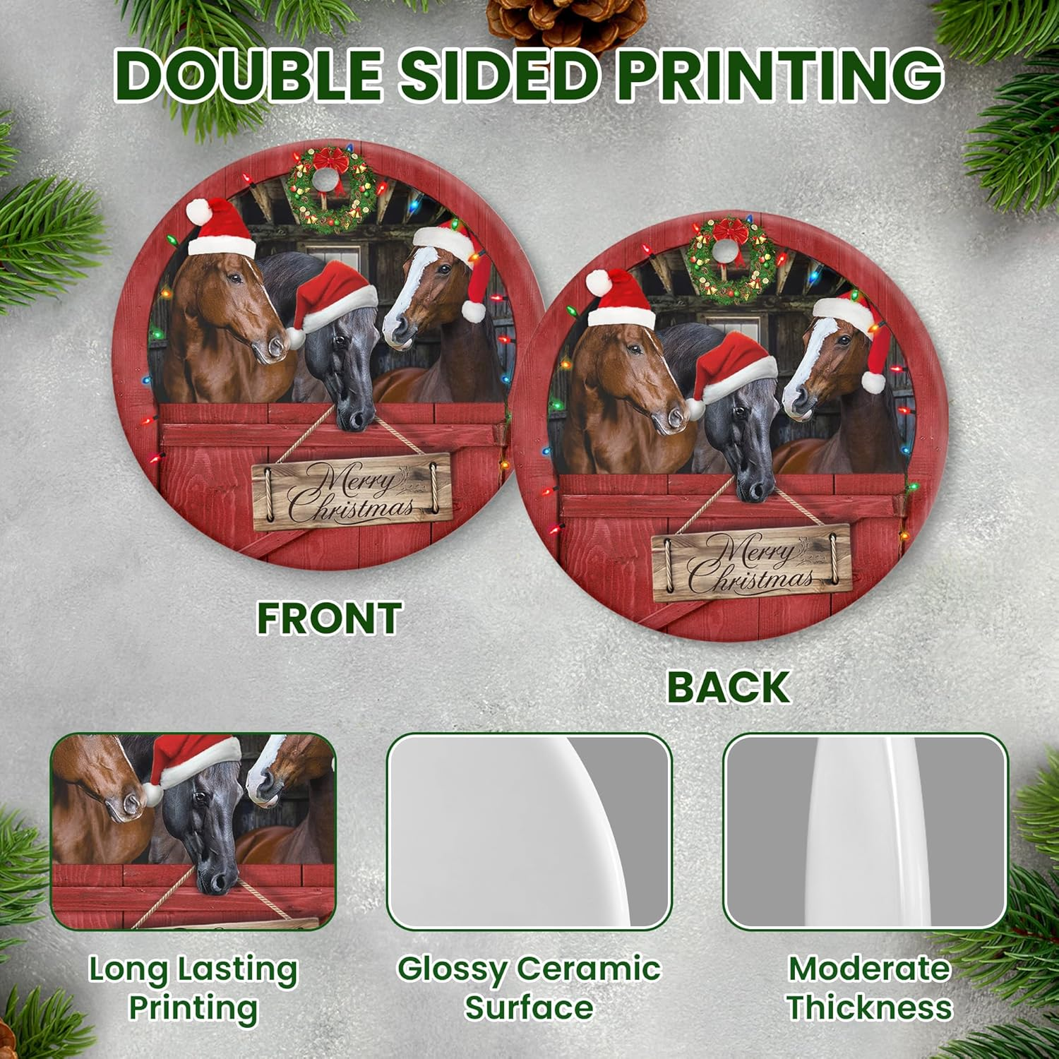 CHRISTMAS GIFTS FOR HORSE LOVERS - Our horse Christmas ornament makes stunning christmas gifts for women and christmas gifts for mom who love their cattle. These ornaments for Christmas trees keep your priceless memories of your horse, or even heifer alive. Liven up your farm with this christmas decorations set. ANIMAL CHRISTMAS GIFTS - These unique christmas ornaments are appropriate for holiday décor in 2025. It makes the ideal stocking stuffers for horse lovers. This farmhouse Christmas decor will keep all special moments on your farm alive forever. Also, make the best christmas gift sets, secret santa gifts. CHRISTMAS TREE DECORATIONS - With these rustic christmas ornaments, you can keep all specious moments of your cute cattle vivid forever. Also, this Christmas decor will serve as a sentimental memento of the gorgeous moment of Christmas, no matter it is horse ornaments for Christmas tree. SUPERIOR FINISHING INSIDE OUT - Double-sided printed. Using premium print is long-lasting and creates colorful, vibrant, bright designs from creative artwork. The ornament design was charmingly drawn by our skilled illustrators. This will add seasonal flair to your Christmas tree, white elephant gifts. PREMIUM QUALITY - The Christmas ornaments are made of high-quality ceramic. The surface is smooth and shiny, durable and lightweight, so it won't crack easily. The elegant printed design style makes ornaments look more textured, and colors are integrated so that they will not fall off or fade. Product description Adorn your Christmas tree with our wide selection of top-quality Christmas ornaments! Decorate your Christmas tree with meaningful ornaments! You may use these ornaments to decorate your home for Christmas, offer them as gifts to friends, or hang them from your tree.