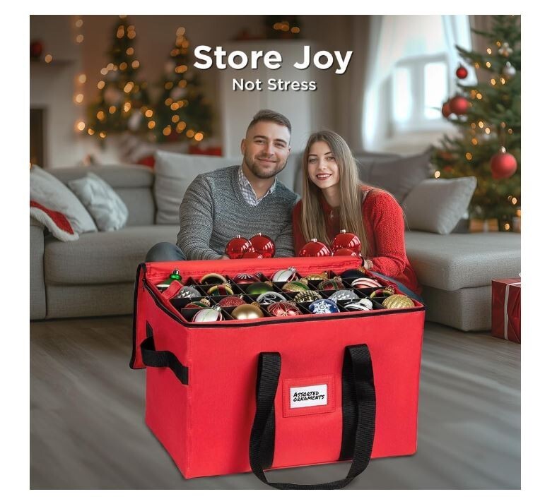 About this item 600D Tear Resistant TEAR RESISTANT 600D MATERIAL: This Christmas Ornament Storage Container will keep your decorations safe and secure. The chest is made of premium quality 600D Tear-Resistant Material. The storage container features durable zippers for easy opening and closing and 3 individual stackable trays that can hold up to 96 - 4-inch ornaments EASY TRANSPORT-DUST PROOF DESIGN: This Christmas Ornament Storage Container comes with 4 individual trays to make your tree decoration fun and hassle free. Container measures 24.75” W x 16.75” D x 16.5" H. The durable cardboard dividers can be adjusted to store big or small or oddly shaped ornaments into the cubes. No need for multiple containers STURDY HIGH-QUALITY CONSTRUCTION: Engineered for a lifetime of quality and service this Christmas Ornament Storage Box is made of highly durable, heavy-duty cardboard, a non-tear 600D exterior. This holiday storage container preserves your ornaments from dirt, dust and debris while the dividers prevent them from bumping into each other preventing breaks. CHEERFUL & FUN HOLIDAY COLORS: The storage container comes in cheerful holiday colors and includes a clear identification card slot so you can label it and readily identify it from your other storage boxes. Durable handles allow you to comfortably carry the container or the tray anywhere. Unlike other trays, ours have side walls ensuring that the ornaments won't slide off PRACTICAL HOLIDAY STORAGE SOLUTIONS THAT YOU'LL LOVE: HOLDN' STORAGE products aim to solve your problems which make life easier for you and because customer satisfaction is the cornerstone of our business, we are confident in the quality of our brand. Everything you love in a Christmas Ornament Storage Container purchased at NO RISK backed by our 100% Satisfaction
