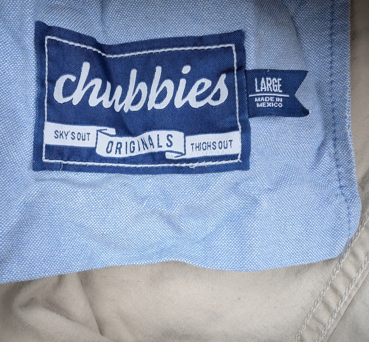 Brand: Chubbies Department: Mens Type: Shorts Size: Large Color: Khaki Style: Casual / Chino Shorts Material: Cotton Blend Fabric Content: 97% Cotton, 3% Lycra Fit: Regular Closure: Button & Zip Waist: Elastic Rise: Mid Rise Pattern: Solid Season: Spring, Summer Country/Region of Manufacture: Mexico Condition: Pre-owned