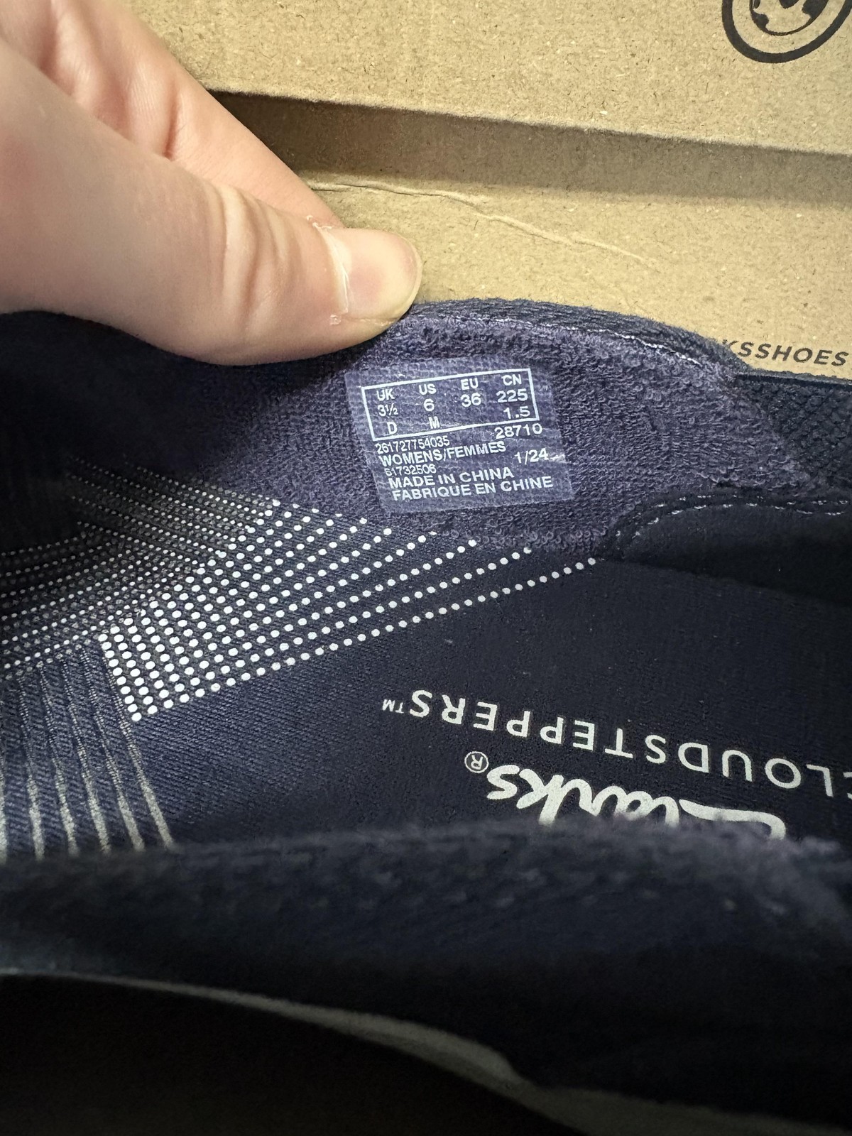 Brand: Clarks Line: Cloudsteppers Model: Breeze Step II casual slip-on shoes. Color: Dark navy upper with white midsole and tan gum-style outsole. Gender: Womens Size on shoe and box: US 6 M, UK 3.5, EU 36, CN 225. Style/Model code: 261727754035; additional inner tag code: L732E06 28710. Materials: Textile fabric upper with cushioned synthetic midsole and man-made outsole (per tags). Details: Slip-on design with elasticized vamp for easy on/off, Cloudsteppers cushioned insole for comfort, washable construction, slingback heel with stretch inserts and cutout detailing, round toe, low-profile sporty silhouette. Outsole barcode sticker lists: BREEZE STEP II DARK NAVY US 6M UK 3.5D. EAN: 5063000105502. Includes the original Clarks branded eco shoe box shown in photos.