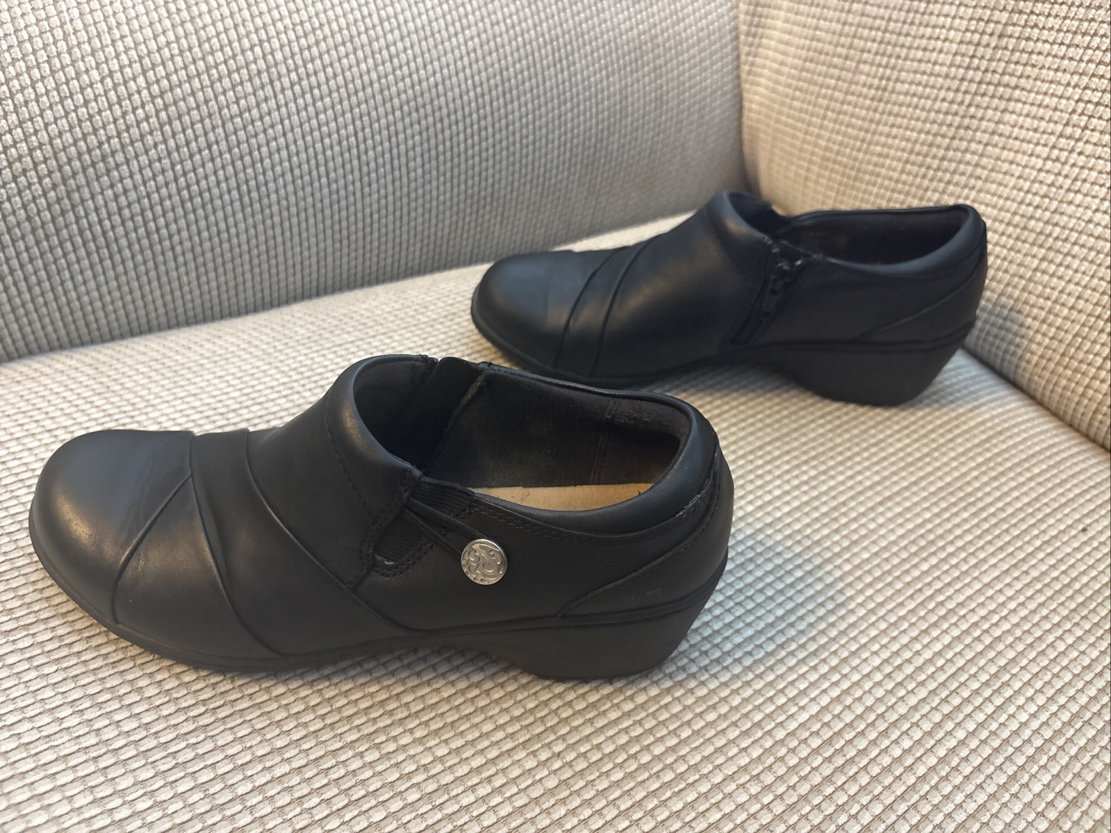 The Clarks Channing Ann Black Leather Zip Comfort Loafer Shoes in women's size 7.5 M are a stylish and comfortable choice for casual or travel occasions. These low-top loafers feature a mid-height wedge heel and a cushioned, lightweight design for all-day wear. The black leather upper and fabric lining give them a sleek look, while the zip closure and button accents add convenience and flair. Perfect for year-round wear, these Clarks shoes offer both style and functionality for the modern woman on the go.