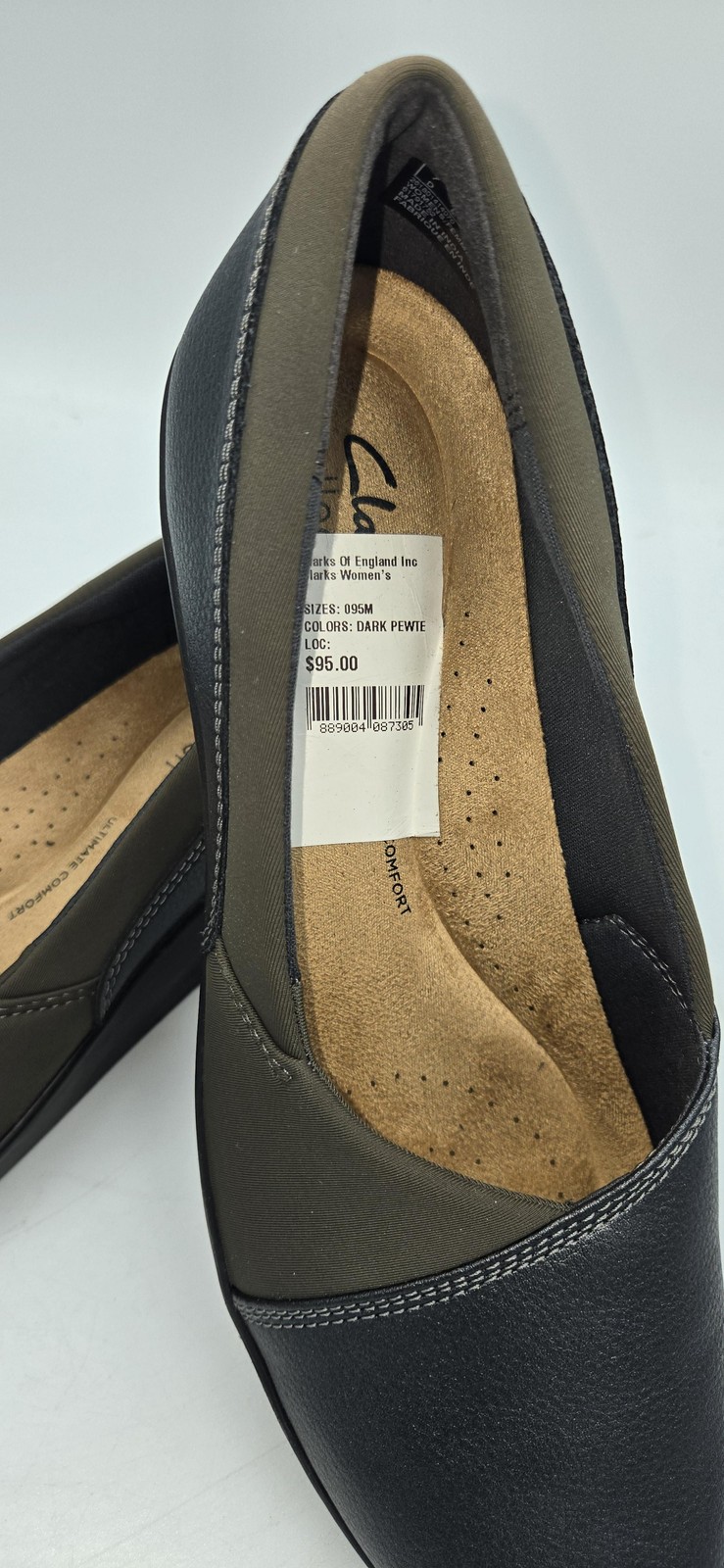 Brand: Clarks Collection Style: Suttyn Walk slip-on comfort wedge shoes with rounded toe and low platform heel. Gender: Womens Size: US 9.5 M (UK 7D) Color: Dark Pewter Metallic with two-tone dark gray and black upper. Materials: Leather/textile upper; balance man made (per sole label). Footbed: Ultimate Comfort cushioned insole with perforated lining for breathability. Details: Elasticized panels for easy on/off, lightweight construction, textured synthetic outsole for traction, ideal for everyday walking or work wear. UPC: 889304108735 EAN: 5063090476204