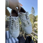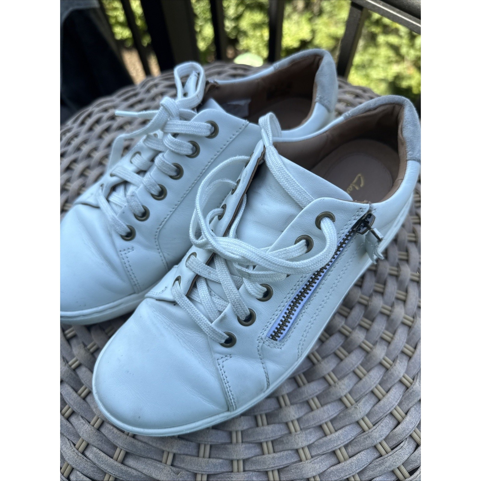 Clarks Nalle Lace Sneakers Zip Women's 8.5W Wide White Leather Comfort Walk ***FAST SHIPPER *** Only worn a handful of times. Look great. Lots of life left. Super comfortable for travel/ walking. The Clarks Nalle Lace Sneakers are a comfortable and stylish option for women in size 8.5W wide. The white leather shoes feature a low-top design with a lace-up closure and a rubber outsole, making them suitable for casual wear, travel, and work during the summer, fall, and spring seasons. With a memory foam insole and cushioned arch support, these sneakers provide all-day comfort for walking activities. The classic white color and subtle logo accents add a touch of elegance to these practical and versatile shoes from the reputable brand Clarks.