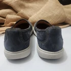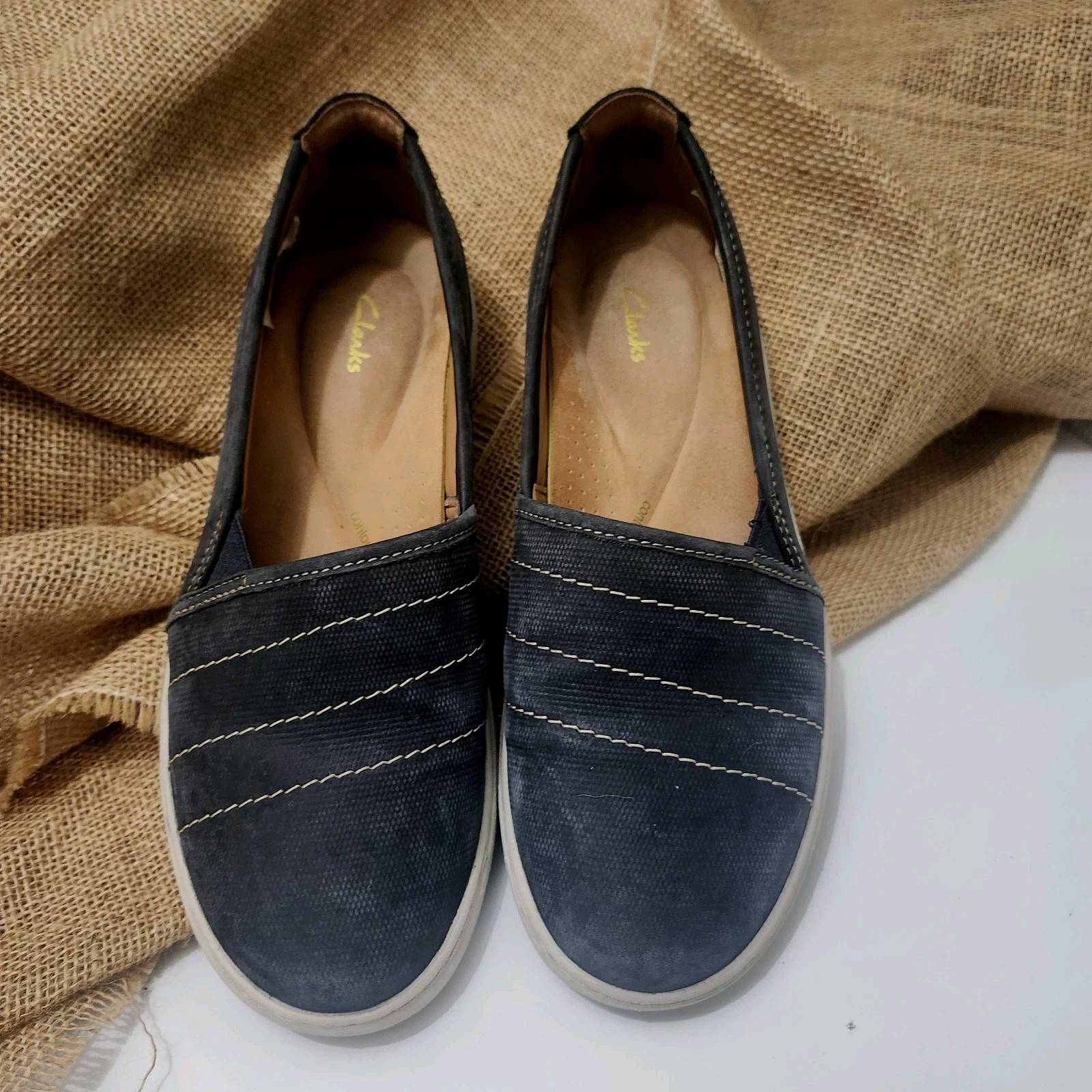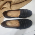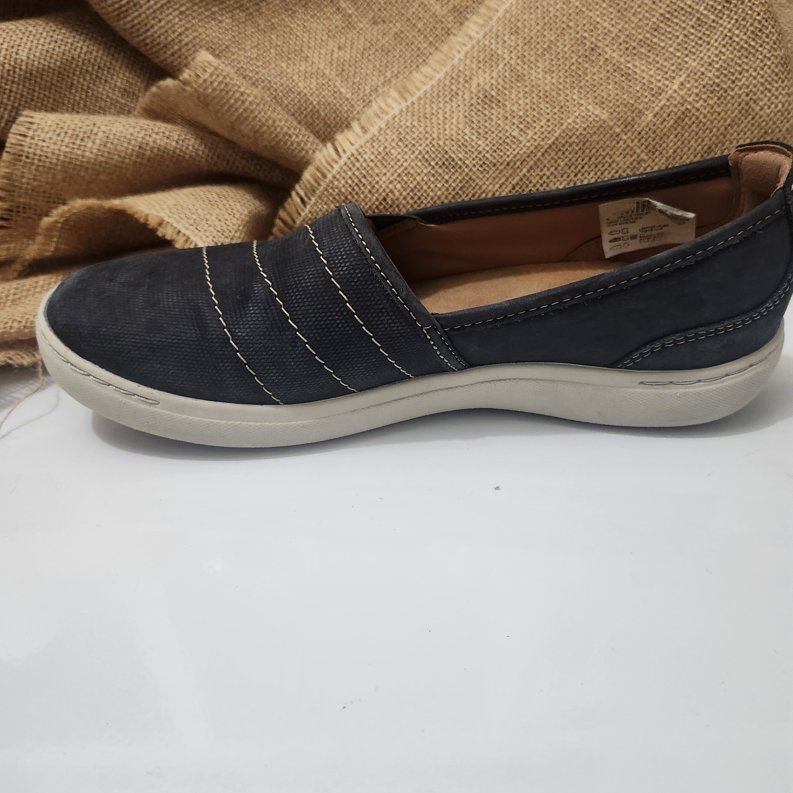 The Clarks Nalle Violet Women's Casual Sneaker in Navy Nubuck is a stylish and comfortable slip-on shoe perfect for casual occasions. With a round toe shape, flat heel, and cushioned insole, these sneakers offer both comfort and support for all-day wear. The nubuck upper and leather lining add a touch of quality, while the rubber outsole provides durability. Whether you're running errands, traveling, or simply relaxing, these Clarks sneakers in size 8 medium are a versatile and classic choice for any season.