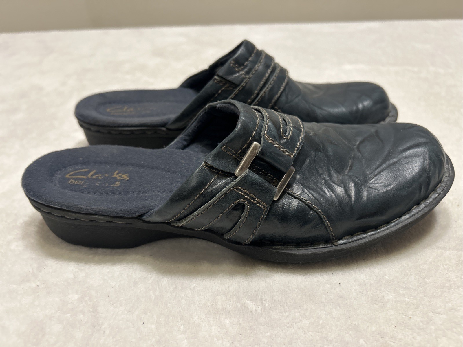Clarks Shoes Mules Clogs Women’s Size 7 Blue Leather Slip On Wedge Comfort