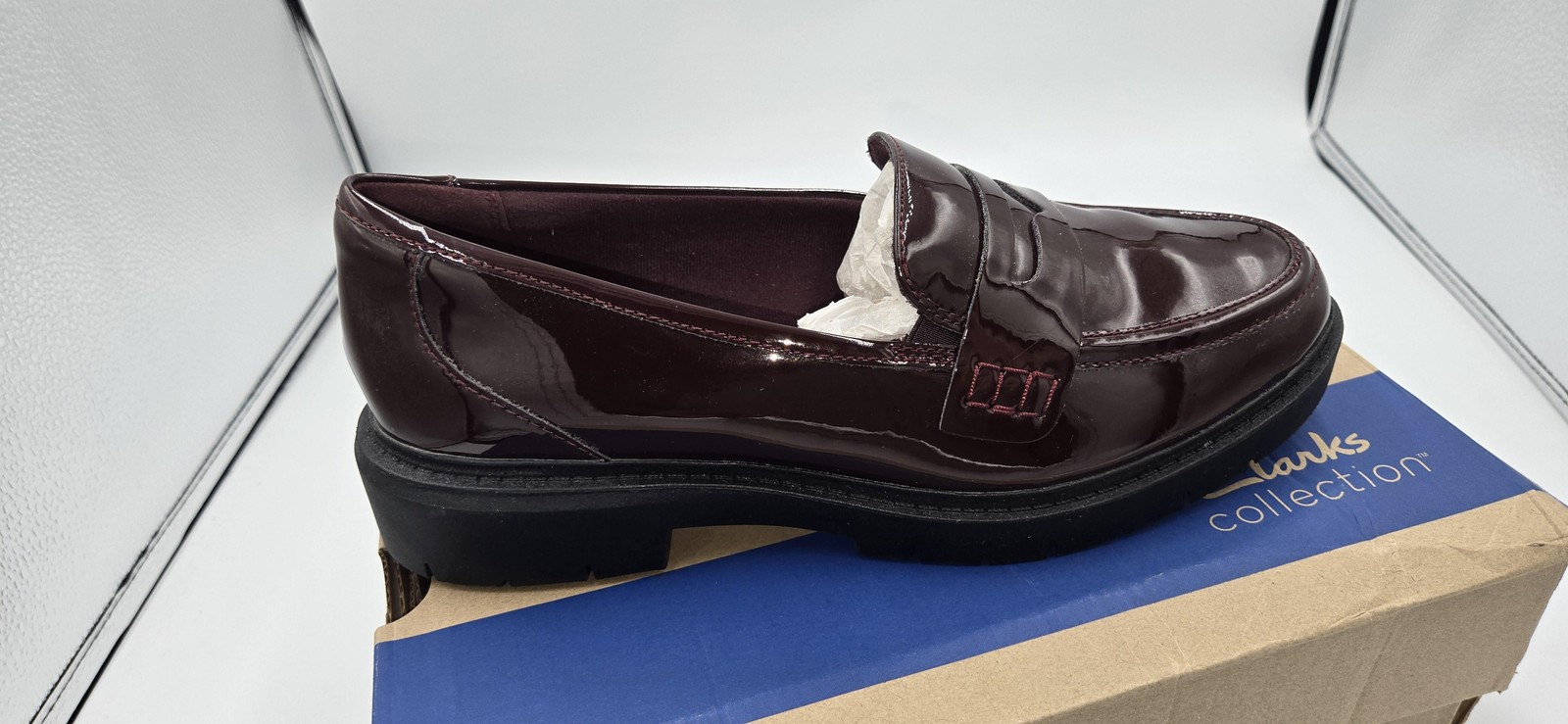 Brand: Clarks Collection Style: Westlynn Ayla slip-on penny loafers with low platform lug sole. Color: Burgundy red patent synthetic upper with black midsole and outsole; burgundy fabric lining; tan cushioned insole. Size: Womens US 7 W; UK 4½ E; EU 37½; AU 7. Materials: Man-made synthetic patent upper; fabric lining and insole; rubber outsole; balance man-made materials. Details: Slip-on design with penny keeper strap, moc toe stitching, Ultimate Comfort perforated cushioned footbed, low 1-1.9 inch platform heel, wide width fit, grippy lug outsole for everyday casual or work wear. Style/Model: Westlynn Ayla; style code 26174454; product line: Clarks Collection. UPC: 889003409719; additional box barcode 980001000010307078270. Includes original Clarks Collection shoe box with tissue paper inserts; box shows creasing, crushed corner, and shelf wear from storage.