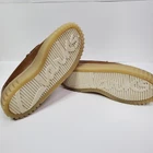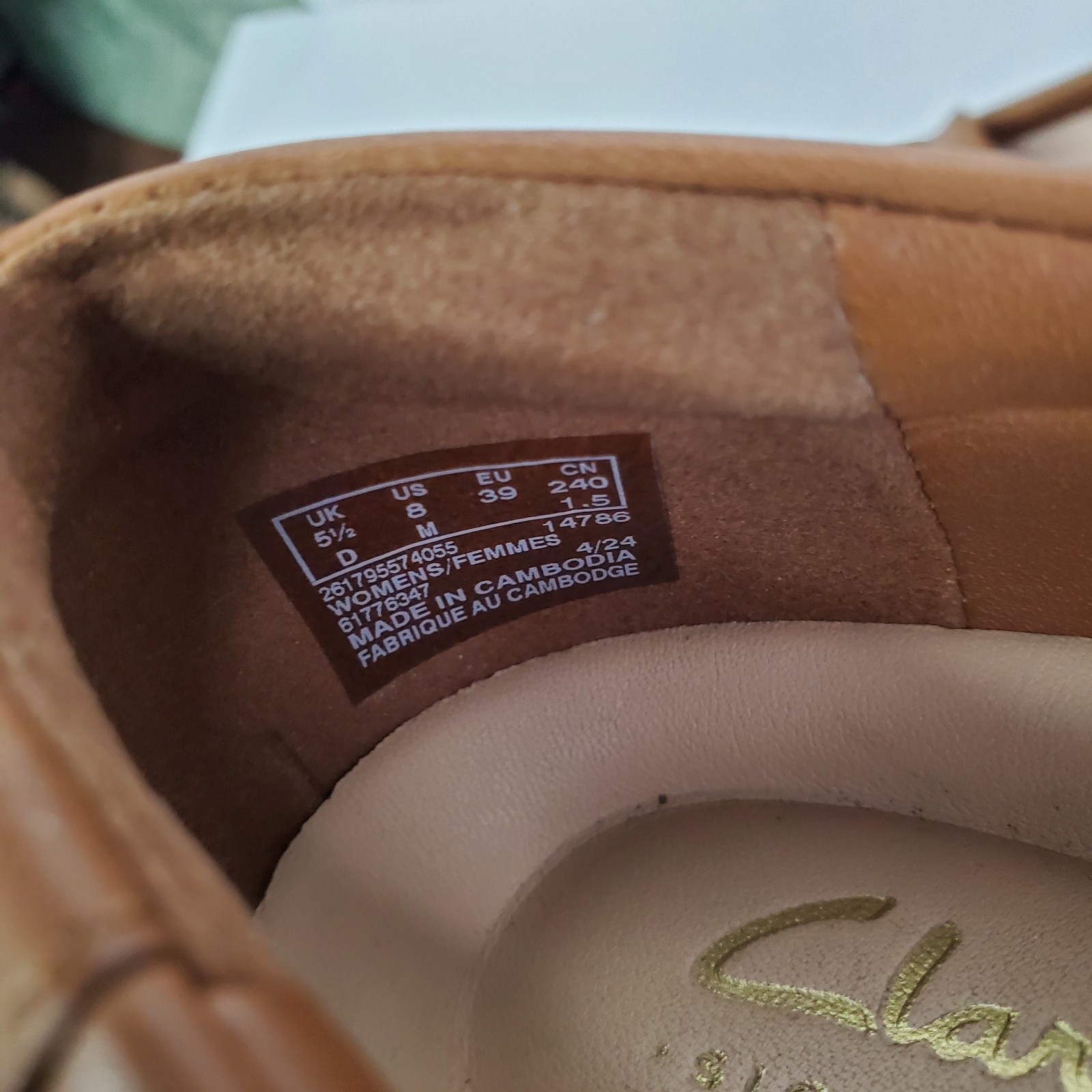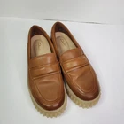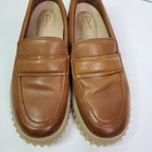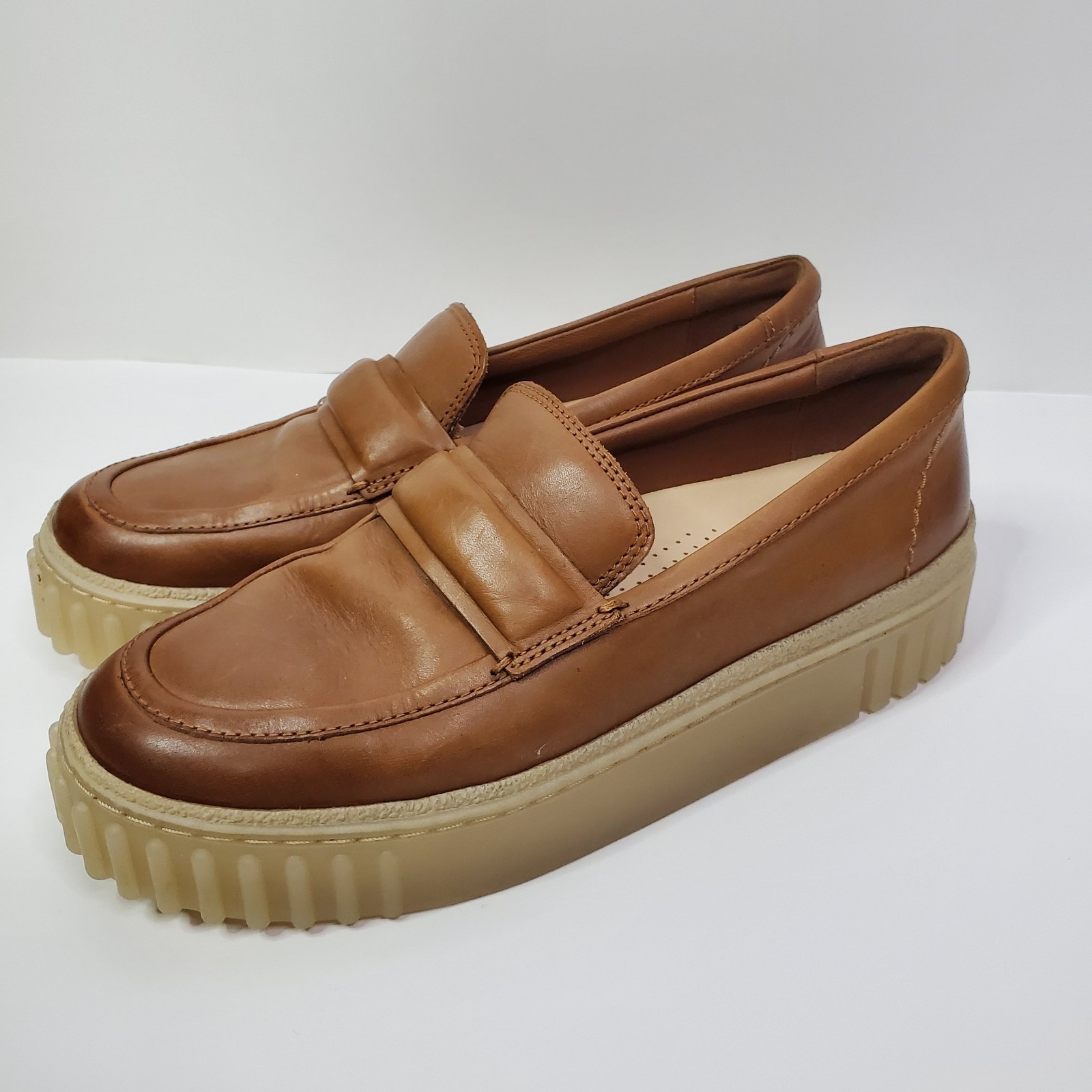The Clarks Women's size 8 Mayhill Cove Tan Leather slip on loafers with a thick sole offer comfort and style. These solid brown loafers feature a slip-on closure and are crafted from high-quality leather. The cushioned sole provides added comfort, making them ideal for casual wear. With a classic loafer style and a sturdy construction, these Clarks shoes are both fashionable and practical for everyday use.