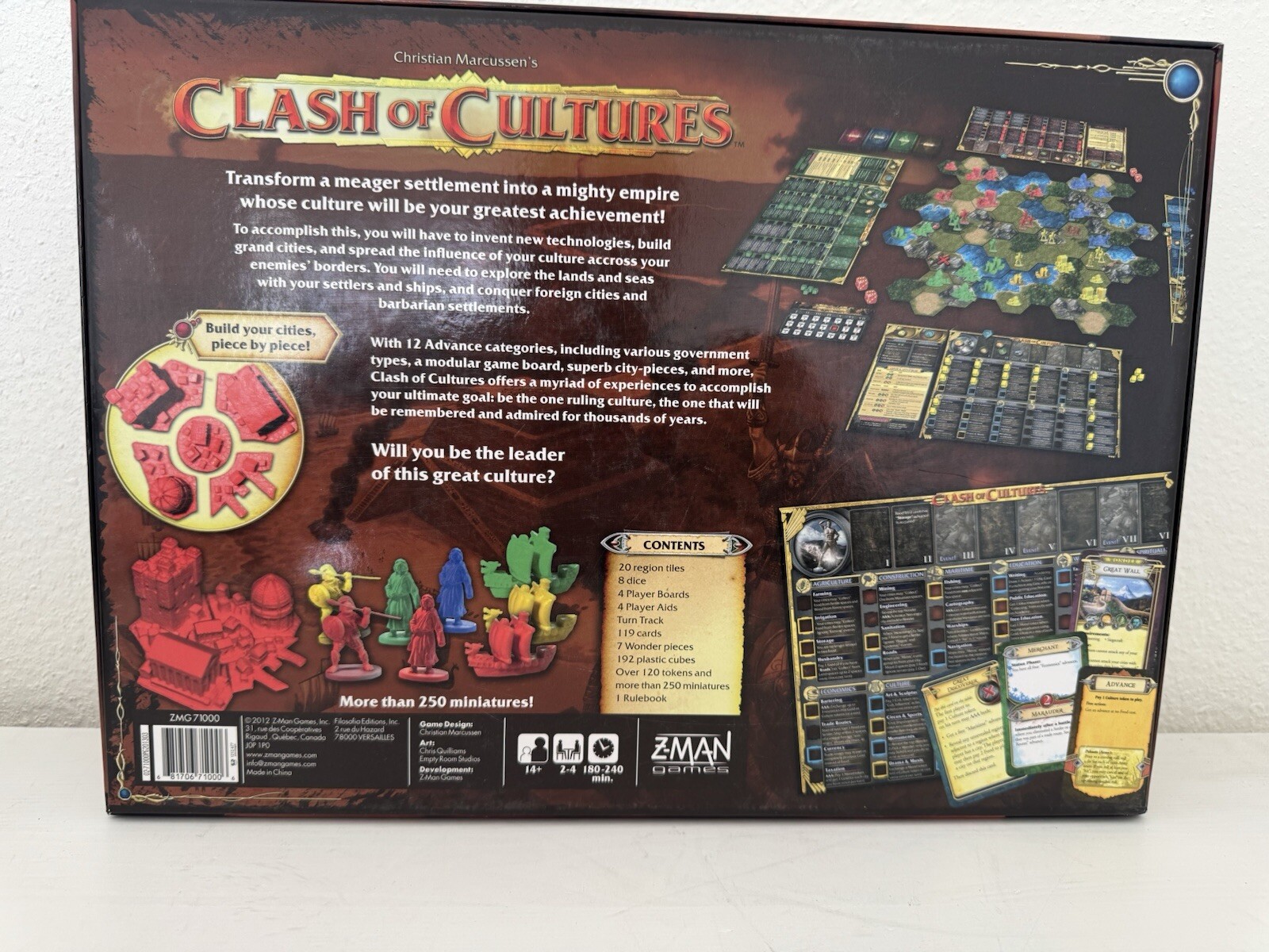 Country of Origin:ChinaMin. Number of Players:4 playersBrand:Z-Man GamesMPN:87515gtin13:0681706710006Year:2012Gender:Boys & GirlsGame Title:Clash Of CulturesTheme:StrategyGame Type:Board GameRecommended Age Range:14+Age Level:12-16 Years, 17 Years & UpUPC:0681706710006Type:Game Board