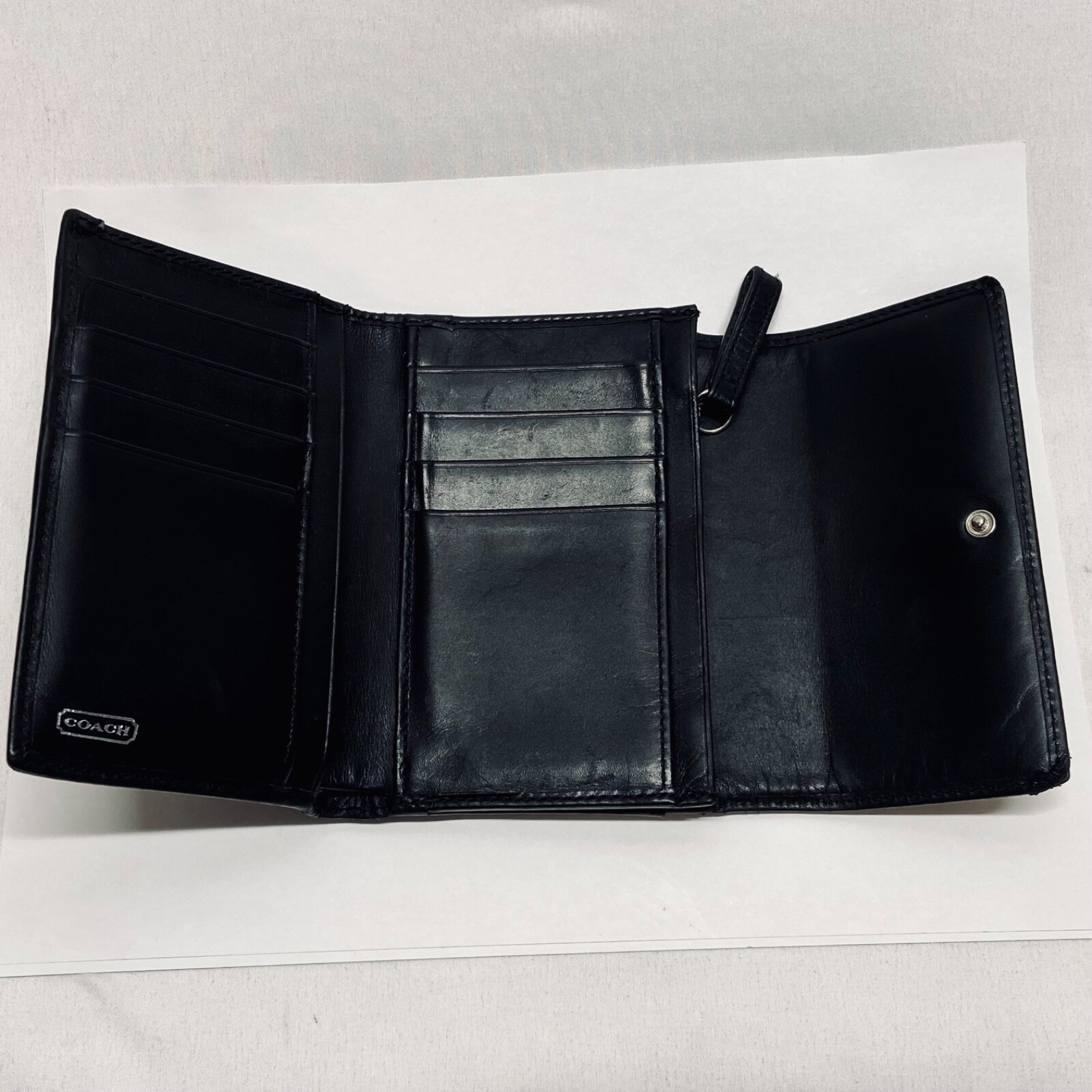 Coach Women's Black Leather Trifold Wallet Snap Front Medium Size Good Condition Item is pre-owned with moderate signs of use. There is signs of wear on the edges. Please see all photos as this is the exact item you will receive. Features 8 card slots and a zippered coin area. Dimensions of wallet are 5.5" w and 3.5" h. Thanks for looking!