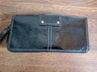 Large Shiny black leather Coach Wallet, Large 9" × 4.5", stain on the inside pictured, 6 card slot, zipper compartment, couple spots are discolored/worn (see last 3 pics), as pictured, no returns. Shipped USPS