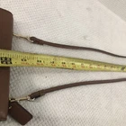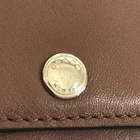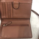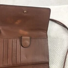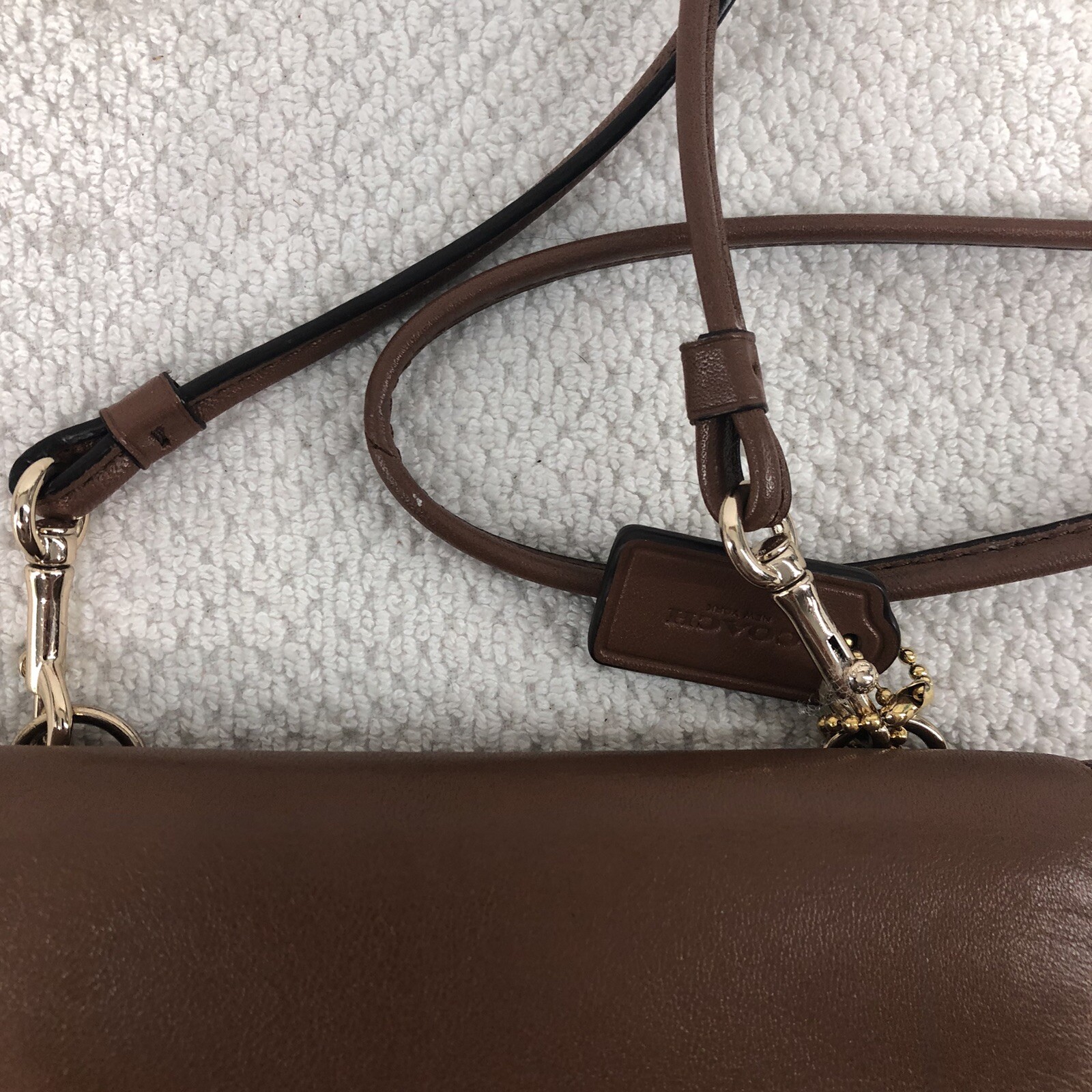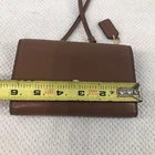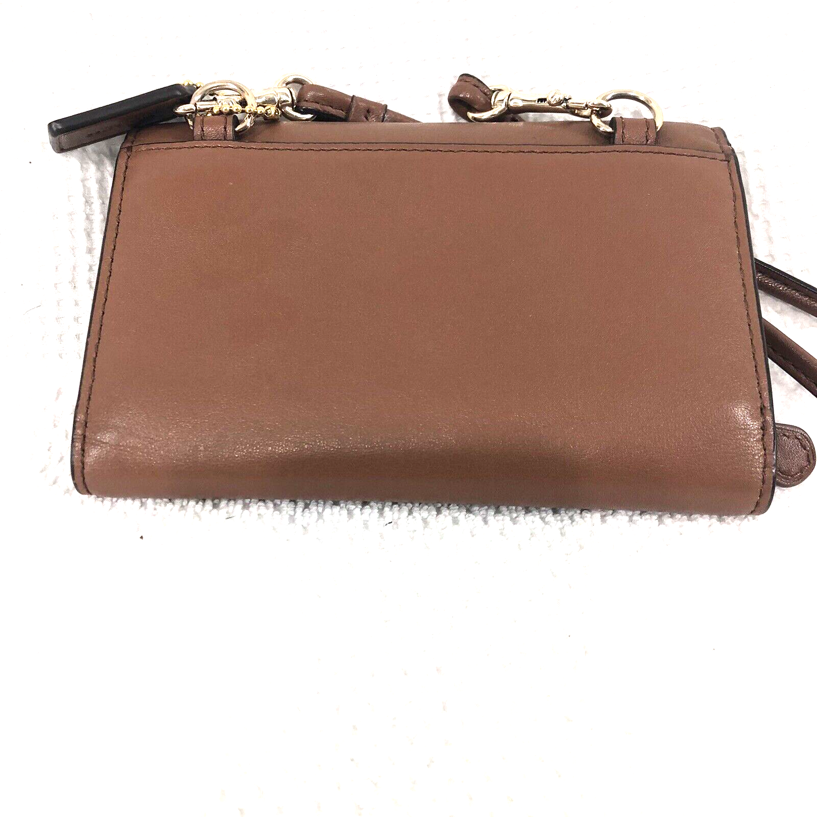 This is a Coach women's wallet in brown leather with a detachable strap. It features a checkbook holder, magnetic closure, and a wristlet style. The wallet is solid in color with an accent strap. It is one size and non-vintage. The brand is Coach and it is not personalized. The material is leather and it is not handmade.