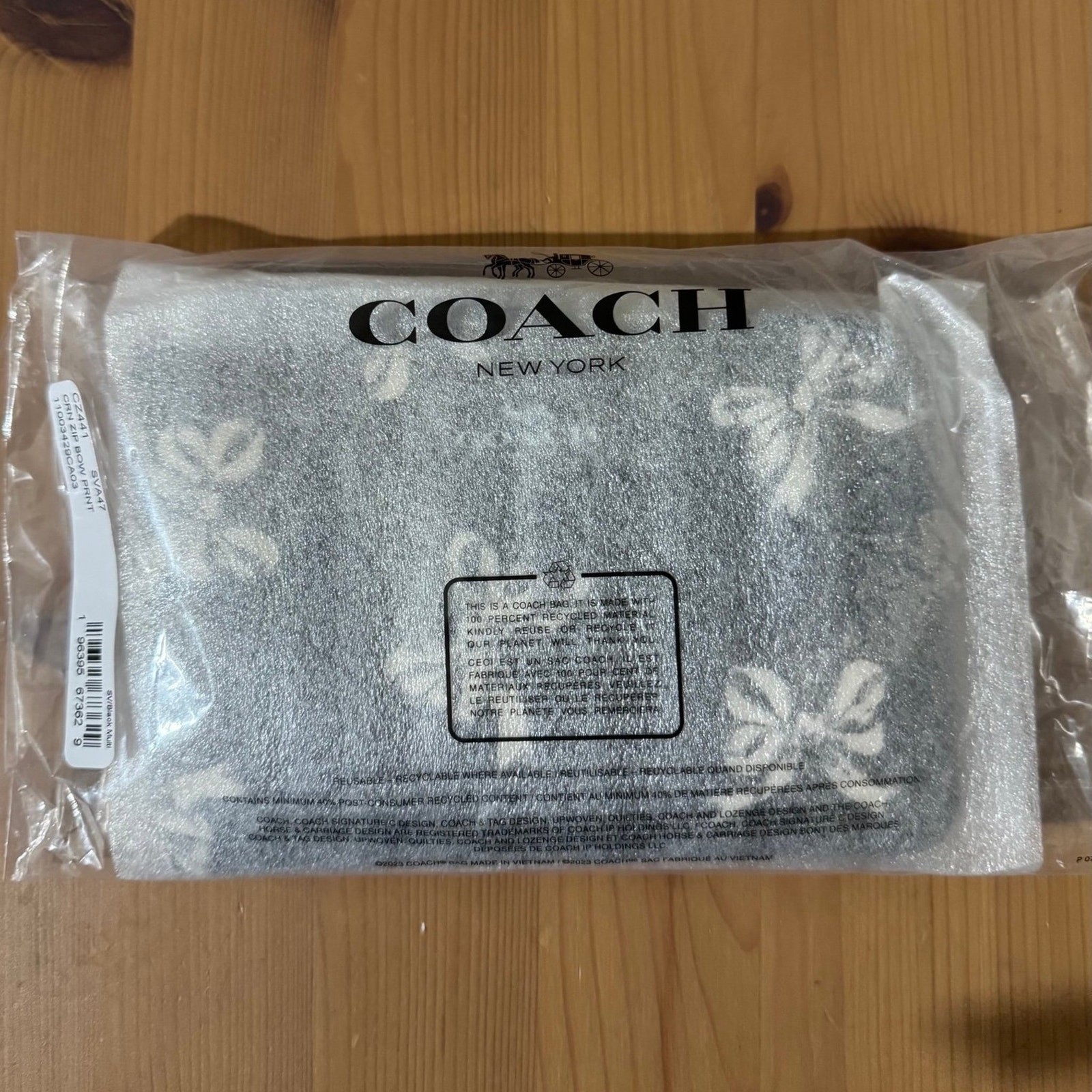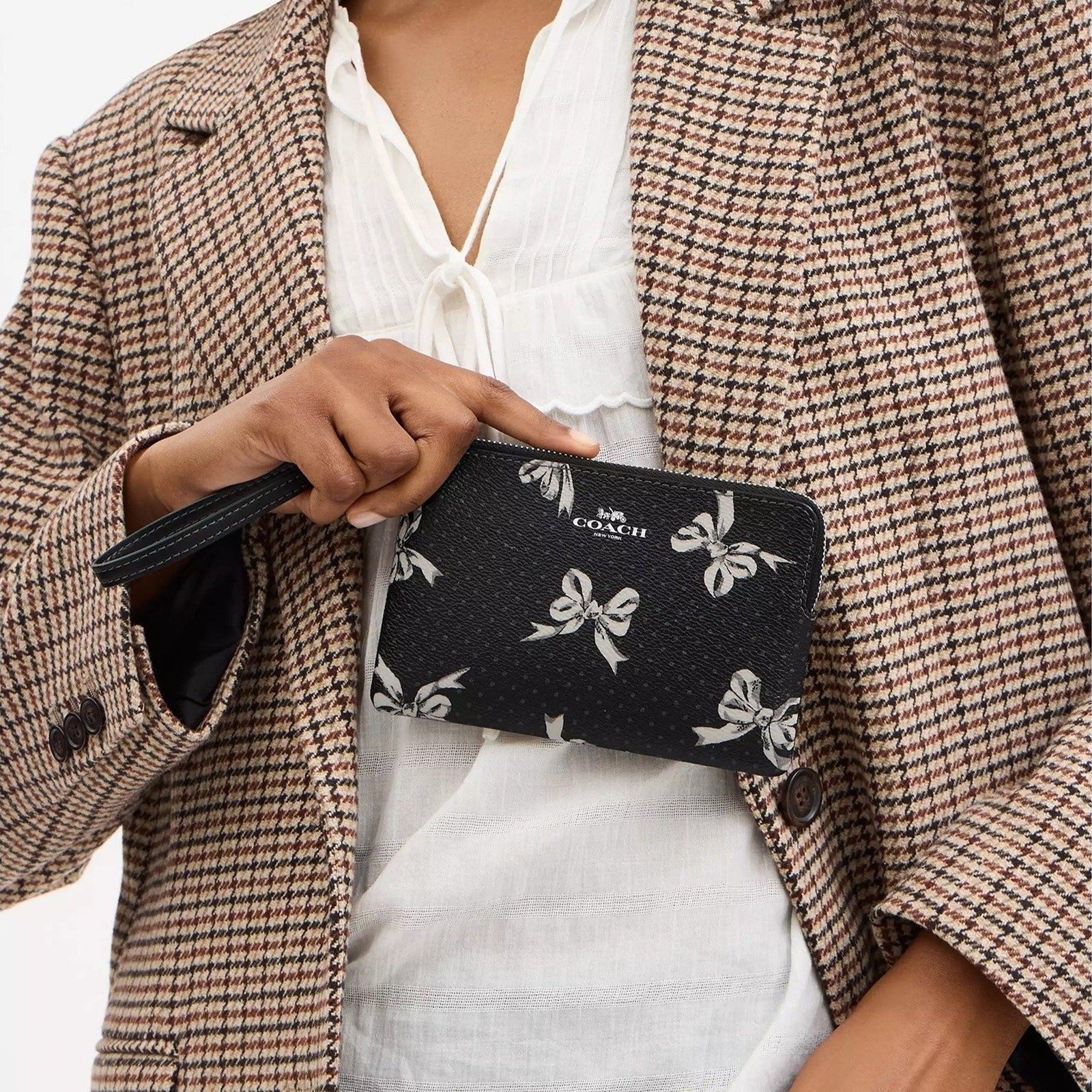 Product Details Style Number CZ441 Measurements Length: 6.25" Height: 4.0" Width: 0.5" Materials Printed coated canvas Fabric lining Strap Wrist strap attached Features Two credit card slots Zip-top closure Placement of the bow print may vary