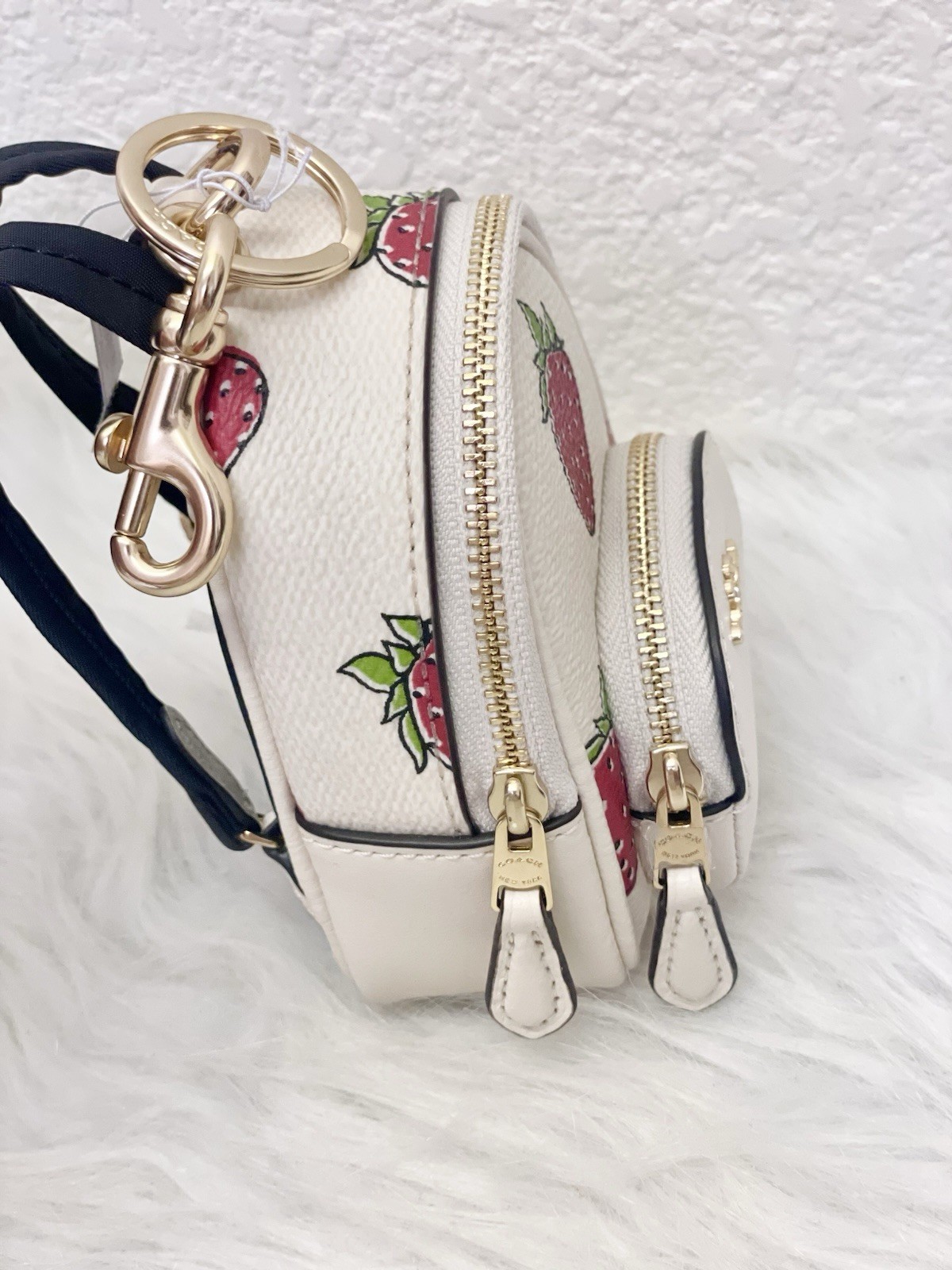 Coach CAO93 Mini Court Backpack Bag Charm With Strawberry Print 100% Authentic Color: Gold/Chalk Multi Brand new with tags Limited Edition SOLD OUT everywhere!! Style Number CAO93 Measurements Length: 1.5" Height: 3.25" Width: 4.0" Materials Printed coated canvas and smooth leather Fabric lining Features Outside zip pocket Zip closure Attached split key ring and dogleash clip Price is firm
