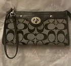 This Coach Penelope Zippy Turnlock Signature Wristlet Wallet is a stylish and functional accessory for women. Made of black leather with a solid pattern and signature character, this wallet features a strap and zipper accents. It is a large size, measuring 8 inches in width and 4 inches in length, and has credit card and folding features. The wallet is in great shape, looking like new. It is perfect for those who want a sophisticated and practical wallet to keep their essentials organized. Whether you're running errands or going out for a night on the town, this Coach wristlet wallet is a must-have accessory.