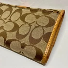 Coach Women's Signature Tri-fold Wallet Brown Khaki Jaquard Leather Trim Vintage This ladies snap front wallet is in good pre-owned condition with minimal signs of use. Please see all photos as this is the exact item you will receive. Please note there are some pen marks on the inside of wallet. Measurements are; 7.75" wide, 4.5" h and approximately 1" deep. Inside features 6 card slots, ID slot, and bill holder. Additional zip pocket on back of the wallet. Thanks for looking!
