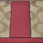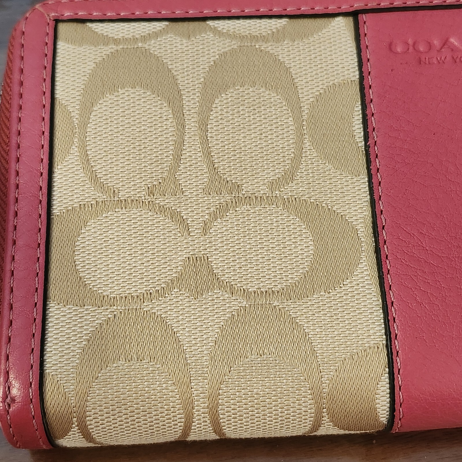 Coach Long Wallet Zip Around Wide Pink Leather Stripe Breast Cancer Pink This beautiful Wallet has the signature jacquard fabric with the center wide pink leather stripe. Multiple credit card slots on both ends of this wallet. One center zipper pocket, fully functional. Also has 5 slip in pocket slots for cash and miscellaneous items. Certificate of Authenticity through Authentic Detective will be included.