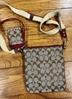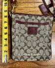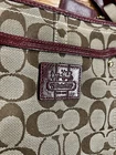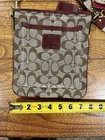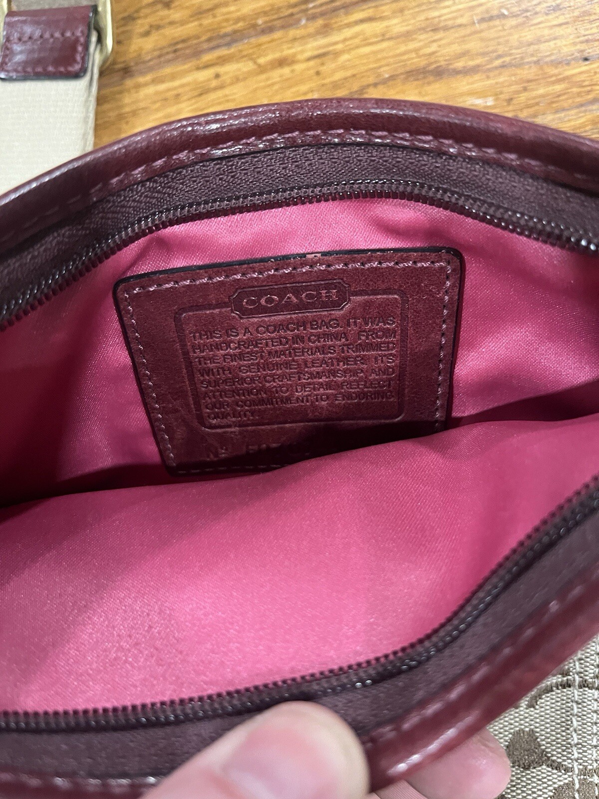 This Coach Poppy crossbody bag is a stylish addition to any woman's collection. The exterior is made of fabric in brown and poppy red, with brass hardware accents. The bag features a red leather handle/strap and is perfect for everyday use. The interior is lined in pink and has enough space for all your essentials. This bag is perfect for any occasion and is sure to turn heads. It's rare to find a crossbody bag with such a unique and elegant design.