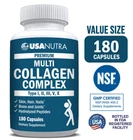 Premium Multi Collagen Complex is a complete balanced blend of the five most important Collagen types I, II, III, V, and X to support healthy looking skin, fuller hair, stronger fingernails, healthy bones, joints, and cartilages, Up to 3600mg per day in convenient capsules that you can take anywhere Includes Bovine and Marine Collagens. Hydrolyzed for fast absorption. 100% Safe and Pure, Third Party Tested, Made in the USA – We produce all of our products in our modern FDA registered / NSF certified facilities located in the USA in accordance with strict United States GMP quality standards which include independent third party testing. Non-GMO, gluten free, sugar free. No added shellfish, milk, tree nuts, peanuts, or soy. BEST VALUE - Large 180 capsule bottle. Compare and save.