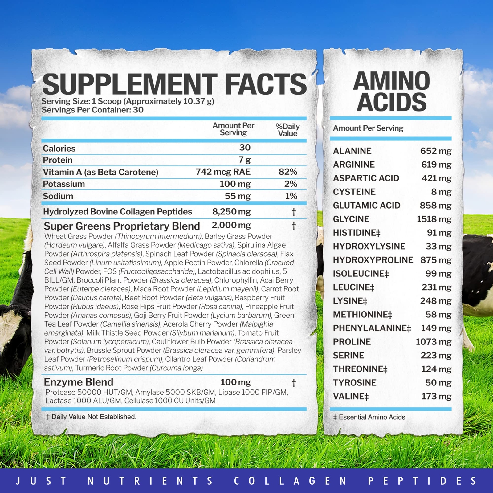 Introducing Collagen Peptides with Supergreens, the perfect solution for those looking to nourish their hair, skin, nails, and joints. This premium blend is packed with natural ingredients that work together to support overall wellness. Key Benefits: Hydrolyzed Collagen Type I & III: The formula is made with premium collagen peptides that are easily absorbed by the body, providing essential amino acids that support the of hair, skin, nails, and joints. Superfoods: Our Collagen Peptides is infused with superfoods, including kale, spinach, and broccoli, that help to boost energy and provide vital nutrients. Digestive Enzymes: We’ve added digestive enzymes to our formula to aid in the absorption of nutrients, so you can get the most out of every serving. Grass-Fed & Non-GMO: Our collagen is sourced from grass-fed, pasture-raised cows, and is free from GMOs, hormones, and antibiotics. Unflavored: Our unflavored formula is perfect for those who prefer a neutral taste and want to add it to their favorite smoothie or recipe. With 30 servings per container, our Collagen Peptides with Supergreens is an easy and convenient way to support your overall wellness. Whether you’re an athlete, a busy professional, or a stay-at-home parent, our premium blend can help you look and feel your best. Don’t wait any longer to support your and wellbeing – try our Collagen Peptides with Supergreens today! HEALTHY HAIR, SKIN & NAILS - Improve your hair, skin, nails and joint with Collagen Peptides with Super Greens! Our proprietary instant absorption formula ensures that you get all the benefits of this premium protein blend quickly and effectively. EASY TO TAKE - Our unflavored collagen peptide is perfect for adding to your favorite drinks, smoothies, or recipes for a boost of nutrients. Plus, it contains digestive enzymes to help your body better absorb and utilize the protein. PREMIUM QUALITY - Our collagen is sourced from grass-fed and pasture-raised cows, ensuring the highest quality and ethical standards. Plus, the addition of super greens provides even more vitamins and minerals for overall wellness support. 30 SERVINGS PER CONTAINER - Each container includes 30 servings, giving you a full month's worth of collagen peptide to help you achieve your and beauty goals. Try it today and experience the benefits for yourself! NATURAL INGREDIENTS - Collagen Peptides with Super Greens are made with all-natural ingredients and contain no artificial sweeteners, colors, or flavors, making it a clean and healthy option for anyone looking to improve their overall wellness.