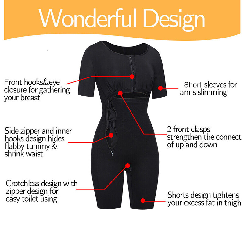 Fajas Colombianas Slim Body Shaper Reductoras Levanta Cola Post Surgery Bodysuit Description 82% Nylon, 18% Spandex Hook and Eye, Button, Zipper closure Hand Wash ALL-OVER CONTROL: This post surgery compression garment applies high compression to your body - it can effectively flatten your belly, slim your waist, hide back bulges, reduce your arms and thighs and lift your hips. It fits you like a glove to smooth everything out and transform your figure in seconds. DOUBLE-LAYER MATERIAL: The powernet on the outer layer adds dimensions and depth to your figure, providing excellent all-over control to your body. The inner lining is super soft and elastic, and soothes your skin. This full body faja enables you to breeze through it while helping you to get back in shape faster. EASY TO WEAR & CONVENIENT DESIGN: We know how valuable comfort can be in compression garments after liposuction or giving birth. ①The buckles and buttons in the front as well as the zipper on the right side for easy putting on/taking off. ②The zipper crotch for easy bathroom use. ③The thinner butt area is breathable and comfy. ④Delicate lace trim to prevent the shorts from rolling up. VERSATILE BODYSUIT SHAPEWEAR: The post op faja does not ride up in the rear area or cut into the inner thighs. Thus, it works great as: liposuction compression garments, postoperative or postpartum girdle, BBL faja garment after surgery, c-section girdle, post partum girdles for women, lipo shaper, and post tummy tuck girdle. It can also be worn under your casual clothes, bridal dress, halloween costumes or clubbing outfits for a total makeover. SIZE & CARE: This full body shaper with sleeves RUNS SMALL. Please refer to our size chart on the left and SIZE UP. No iron or chlorine bleaching. Hand wash recommended. Please wash it before usage. How to wear: START WITH THE LEGS and slowly get into it UNTIL THE CROTCH AREA fits right. Next, PULL IT UP AND GET YOUR ARMS INTO THE SLEEVES. Then CONNECT the lower connection and zip up. CONNECT the upper connection and SLOWLY PULL the zipper up. Lastly, SNAP THE 2 BUTTONS in the chest area. Products Detail The Body Shaping Add The Buckle on The Chest Position Inner Hooks and Zipper Design Zipper on The Cotch Bottom Knee Length and Lace Side Products Function HAPPY SHOPPING: all of our products have our 30-day return policy . Look great and feel fabulous in the latest underwear body suit for women, Order Today. SIZE NOTE: Please measure your body and use the size chart in the images to select your size. If you are between sizes please size up. It is normal if you find it hard to squeeze in, but once on it will do its job. Payment Shipping Terms of Sale About Us