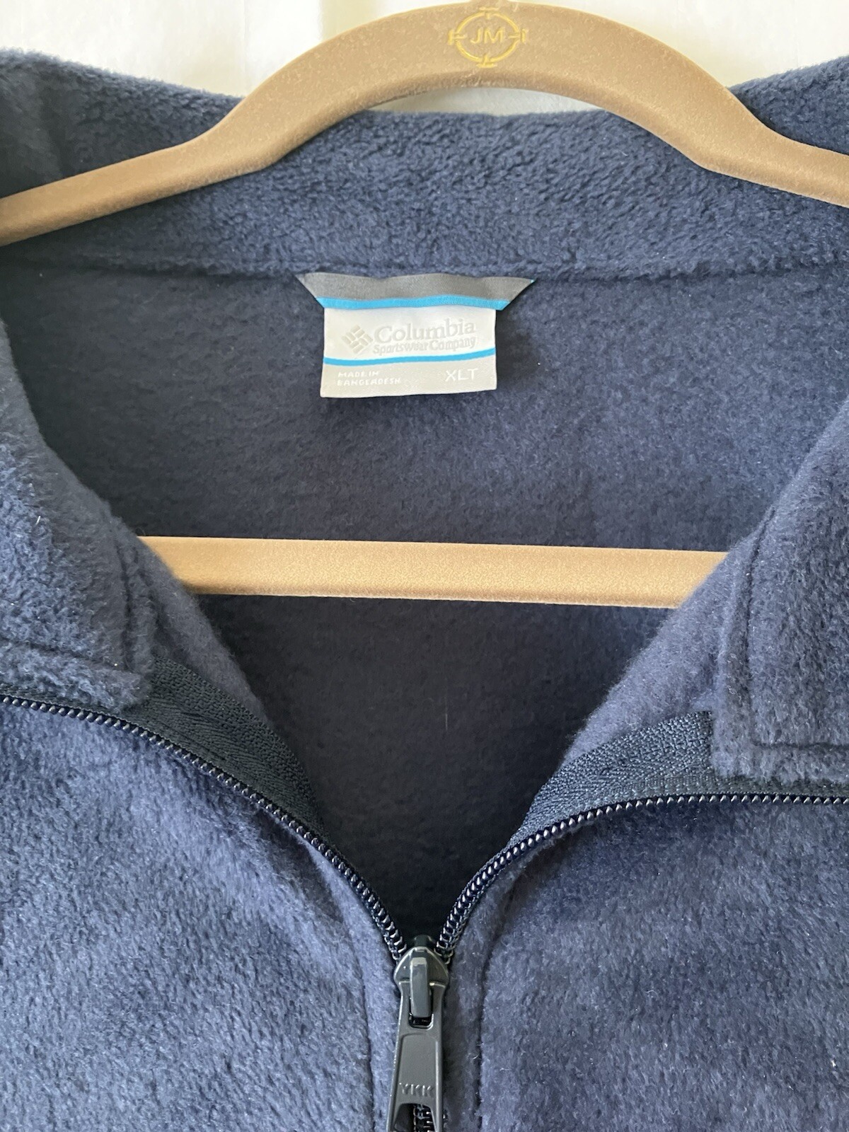 Columbia 100% polyester men’s jacket, navy blue, XLT, full zippered front, zippered side pockets Machine washable cold Tumble dry low Chest 52” Collar to hem length 32”