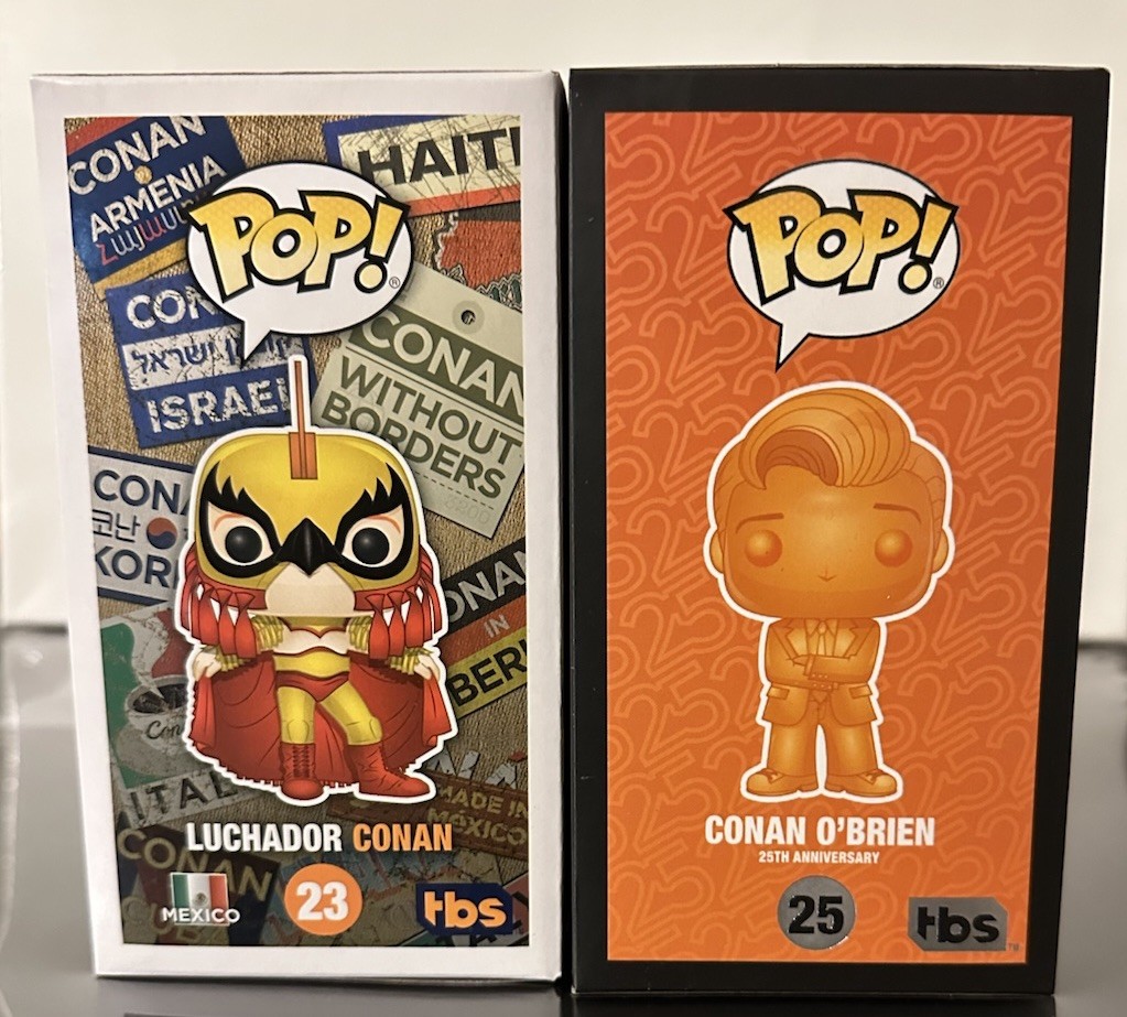 The product is a set of two FUNKO Pop! vinyl figures featuring Conan O'Brien Gamestop exclusive Luchador #23 and 25th Anniversary #25 versions. These collectible figures are part of the Pop! Vinyl product line and are designed in orange color with a standard size. The figures are part of the Conan franchise and were released at the San Diego Comic Con as exclusive items for the 25th anniversary.