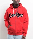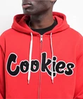 Founded by Bay Area rapper Berner, Cookies delivers the Chenille zip hoodie with textured, bubble-letter branding embroidered on the front for a luxurious vibe. Offering two hand pockets and a full zip closure, the warm long sleeve sweatshirt is ready to combat chilly weather with an adjustable drawstring in the hood. Chenille Red Zip Hoodie from Cookies. Embroidered chenille branding on chest. Woven brand label on bottom hem. Full zip closure. Dual slash hand pockets. Adjustable drawstring hood. Brushed interior. Ribbed sleeve cuffs and bottom hem. 70% cotton, 30% polyester. Machine wash cold, tumble dry low.