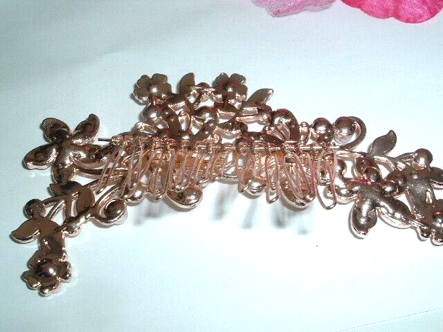 Perfect for a wedding, prom, night on the town, anytime you want to be glamorous and sparkle. A 4" wide copper slide hair comb with white pearls and rhinestone flowers, never worn, condition is pristine.
