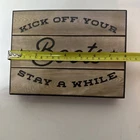 8 x 6 wall plaque says kick off your boots. Stay a while. New with tag still on it. See photos for condition. Please see all pictures for condition as for it is part of the description. Due to lighting, colors can vary slightly from pictures. ***Please take note*** Flat rate shipping is for the 48 inland states only! if you are purchasing and shipping to Alaska, Hawaii or Puerto Rico, please contact me before purchasing to get a shipping rate. Thank you for shopping!