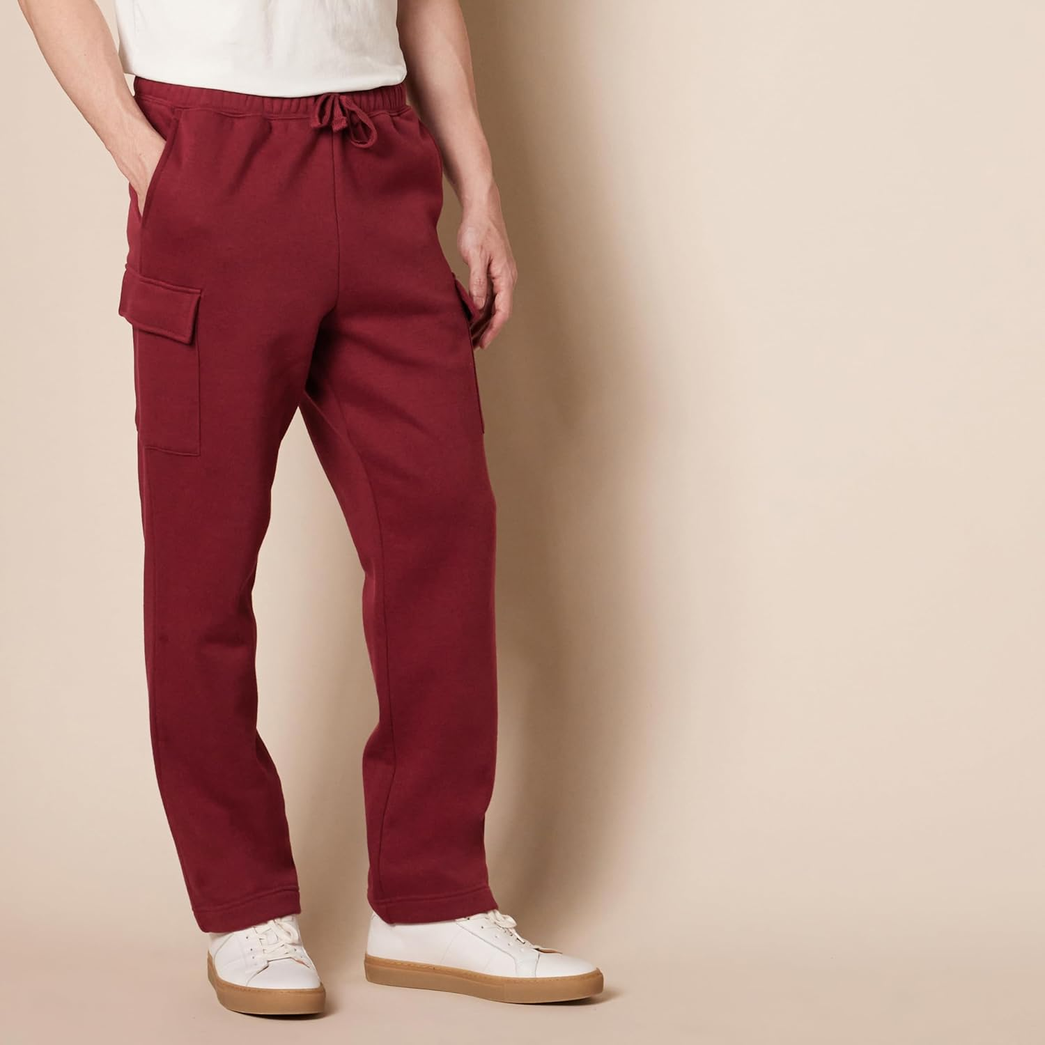 The Amazon Essentials Men's Fleece Cargo Sweatpants are designed for those who value comfort and functionality in their activewear. Crafted from high-quality fleece, these sweatpants provide a soft and cozy feel, making them perfect for lounging at home or running errands. The cargo pockets add practicality, allowing you to carry essentials like your phone or keys without the need for an additional bag. Whether you're hitting the gym, going for a casual walk, or simply relaxing on the couch, these sweatpants offer the versatility you need for various activities. Engineered with a focus on durability and style, these sweatpants feature an elastic waistband for a secure fit and adjustable drawstrings for added comfort. The dark red color provides a modern touch, making it easy to pair with your favorite tees or hoodies. With consistent sizing, you can shop with confidence, knowing that these sweatpants will fit as expected. Elevate your wardrobe with the perfect blend of comfort and practicality that the Amazon Essentials Men's Fleece Cargo Sweatpants deliver. Soft and cozy fleece material for maximum comfort. Functional cargo pockets for convenient storage. Elastic waistband with adjustable drawstrings for a personalized fit. Durable construction designed for long-lasting wear. Stylish dark red color that complements a variety of outfits.