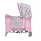 CREW: COTTON CANDY PINK: DELUXE DOLL PLAY YARD - PINK & GREY POLKA DOT - Deluxe Doll Play Yard with bright, fun cotton candy pink and gray polka dot pattern is made with a robust -coated steel tube frame and thick, durable polyester material, this play yard is built to withstand even the most enthusiastic play sessions. This play yard is more than just a playtime accessory; it's a delightful world of imagination and endless possibilities. The cute Pack and Play includes some unique features like; removable multi position canopy, double side mesh pocket for accessories and real spinning back wheels for easy mobility. With mesh on both sides, you can watch your baby doll sleep peacefully or engage in playful adventures. It's the perfect way to bond with your as they nurture their dolls and bring their imaginative worlds to life. When it’s time for sleep-overs the Doll Play Yard is perfect for travel, it folds up and fits into its own matching carry bag! It's not just a play yard; it's a world of imagination and creativity waiting to be explored. Designed for dolls up to 18" (46 cm). ***Doll not included.*** This product is made for 3 years and up. FEATURES: Multi position canopy, double side mesh pocket for accessories, and a real spinning back wheels for easy mobility. FUNCTIONING: Play yard comes with a retractable canopy to protect your dolls from the elements. FOLDING: Play yard is easy to fold for storage and travel. Take it everywhere! DOLLS UP TO 18": The Cotton Candy Doll Yard is designed for dolls up to 18" (46 cm). Play with your favorite doll, plush or stuffed animal in style!