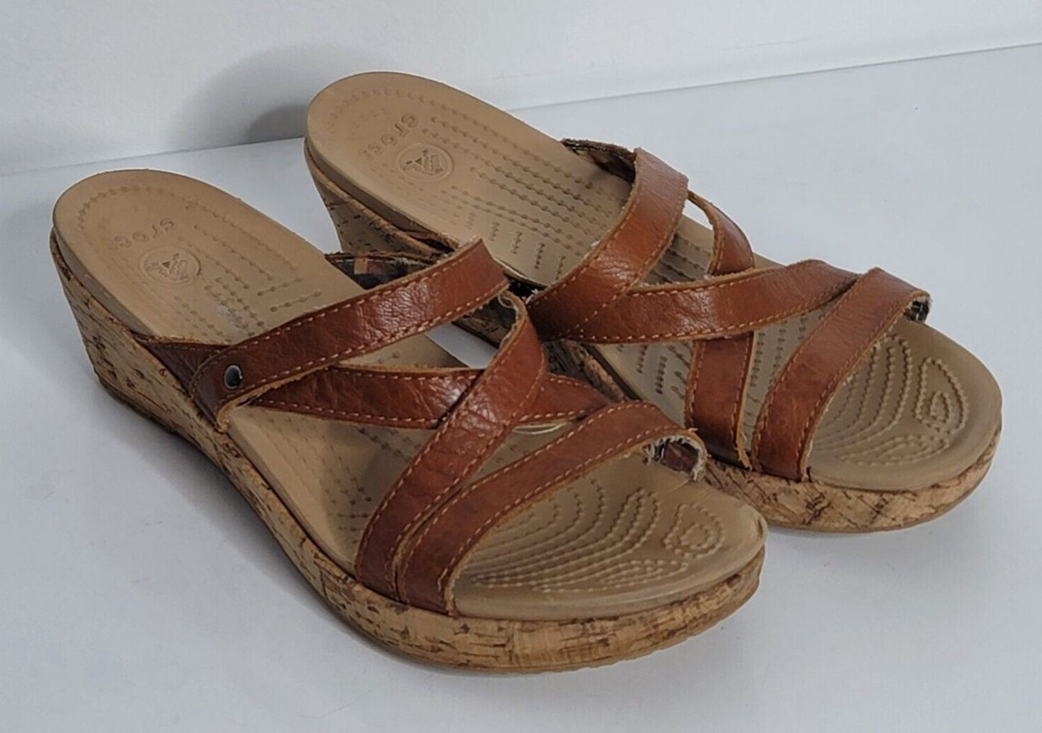 Crocs Women's A Leigh Sandals Brown Tan Leather Wedge Strappy Open Toe Slip On Size: Womens 8 See pictures for description of condition. Shipping USPS is the service used for shipping. We ship to all 50 states and APO addresses. International Buyers Import duties, taxes, and charges (typically collected upon delivery or pickup) are the buyer's responsibility and are not included in the item price or shipping charges. Please check with your country's customs office prior to bidding/buying to determine what these additional cost will be. Terms If you have any questions or need information, please feel free to email us via the link above. Please don't forget to check out all my auctions. Good Luck!