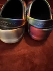 The product is a pair of Crocs Bistro Clogs designed for unisex adults, with a slip-on style and featuring the Croc's Lock slip-resistant tread. These colorful clogs are in a multicolor design, suitable for both men and women with a US shoe size of 10 for women and 8 for men. The shoes are made of synthetic material and are ideal for casual wear, specifically created to provide comfort and safety in work environments like kitchens or restaurants.