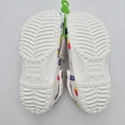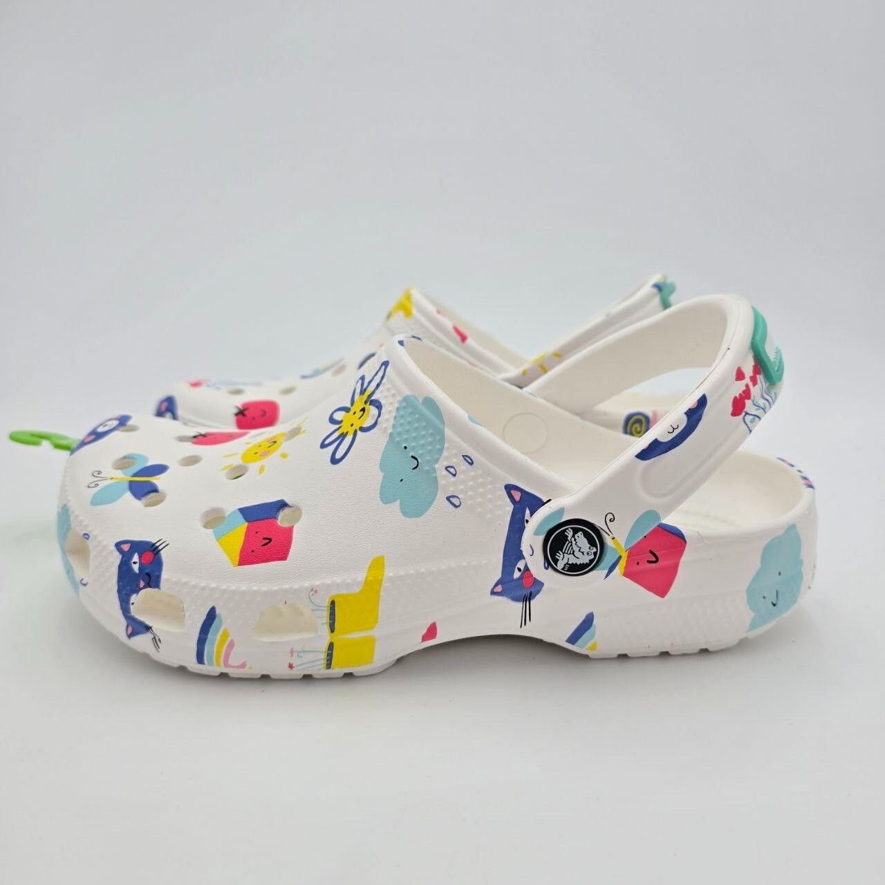 The Crocs Classic Doodle Print Clogs in Kid's Size 4 are white slip-on shoes designed for casual comfort. Featuring a round toe shape and flat heel style, these clogs are lightweight, waterproof, and cushioned for all-day wear. The colorful doodle print design adds a fun and playful touch, making them ideal for activities like walking, beach outings, or school. With a breathable synthetic upper and ankle strap for a secure fit, these Crocs are perfect for kids who enjoy expressing themselves with unique and vibrant footwear.