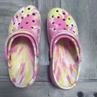 This item is a pair of Crocs Classic Platform Clog in a FUN marbled pink, yellow, and white multi-color design. They are size 8 for women and have a casual style. The upper material is rubber, and they feature the brand's classic clog silhouette with a platform sole. Perfect for adding a fun pop of color to your outfit while enjoying comfort and support. These women's clogs have been very gently used.