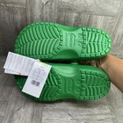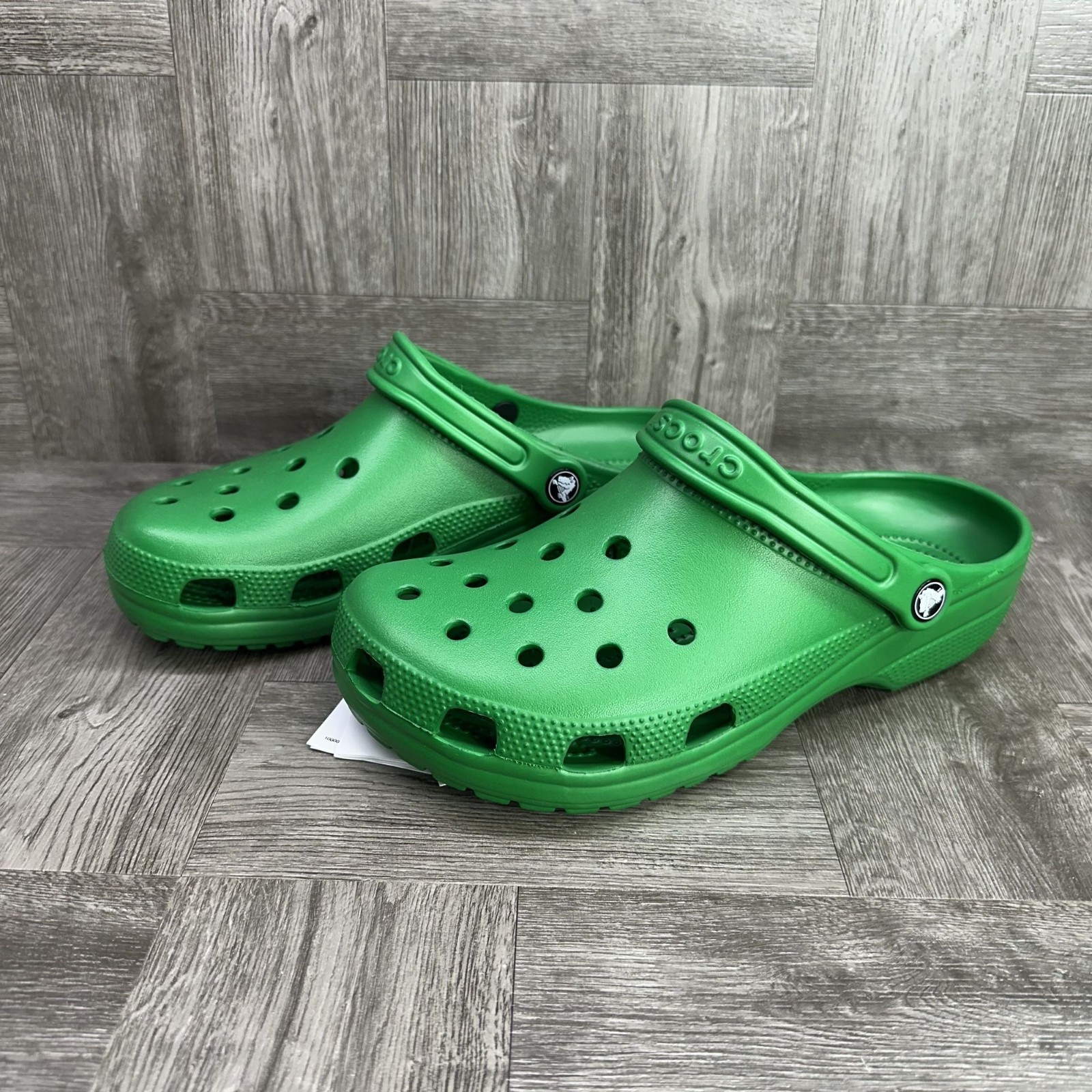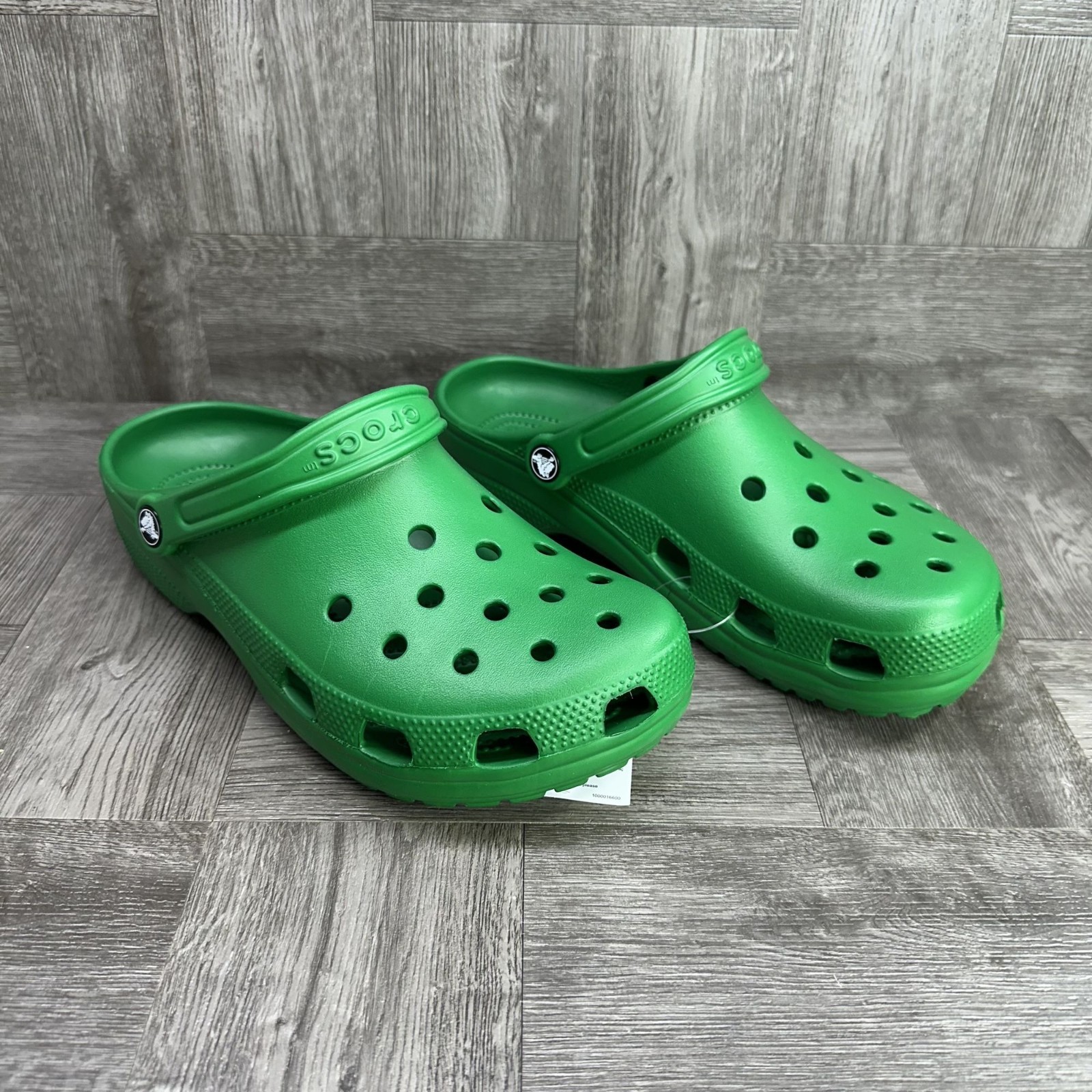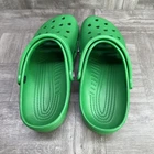 The product is a pair of Crocs Classic Men's size 9/Women size 11 green comfort clogs. These slip-on clogs are designed for casual occasions and feature a solid green color with a round toe shape and a low top shoe shaft style. The clogs are made of rubber upper material and synthetic lining, providing comfort and durability. With a flat heel style and standard shoe width, these clogs are suitable for walking and can be worn in various seasons such as summer, fall, and spring.