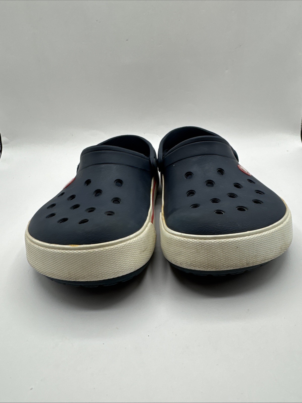Crocs Crocband Clogs Slip-on Unisex Adult Size Men 6 Women 8 Navy White Red Pre-owned. Some wear and discoloration on white as shown. See measurements and pictures.