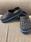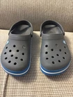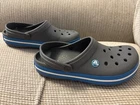 The Crocs Crocband II Clogs in gray and blue are designed for both men's size 6 and women's size 8. These slip-on clogs feature a solid pattern with a comfortable flat heel height, making them suitable for casual wear. The clogs are made of rubber material, with a synthetic lining and rubber insole for added comfort and breathability. The Crocband II style from the Crocs brand offers a standard width fit and is a versatile choice for everyday activities.