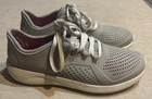 Elevate your casual style with these Crocs LiteRide Pacer sneakers in a beautiful gray mesh design. These lace-up shoes feature a round toe shape and a standard shoe width, making them comfortable to wear for walking or any casual activity. The rubber outsole material provides durability, while the breathable features ensure your feet stay cool and comfortable. These sneakers are perfect for women who appreciate a classic theme and are looking for a stylish and comfortable pair of shoes. The Crocs brand is known for its quality and these shoes are no exception. Get your hands on these Crocs LiteRide Pacer sneakers today and step out in style! These shoes are in good preowned condition with light signs of wear on the bottom of the shoe. Please see ALL photos for a better idea on condition, any measurements, or details to the shoes.