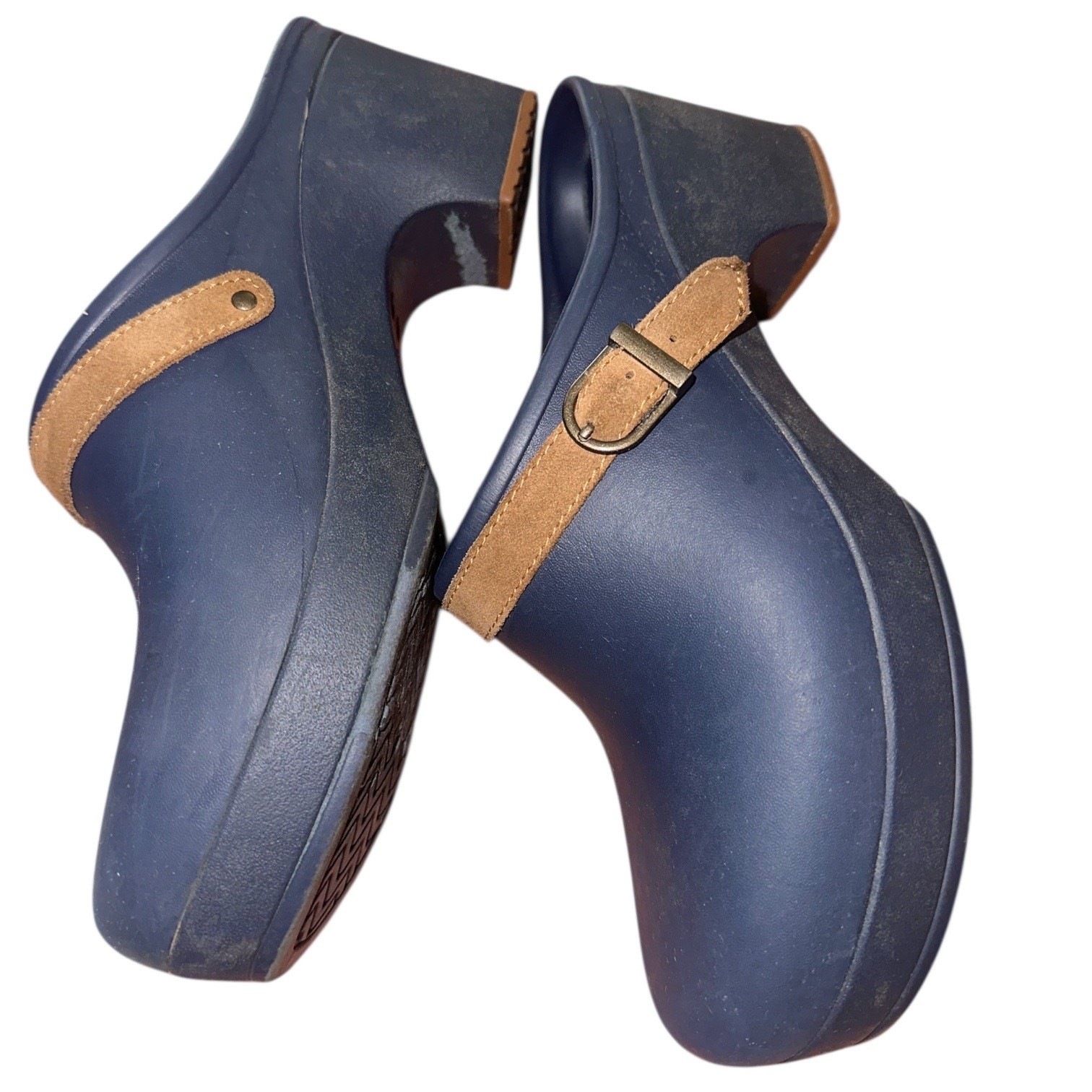 These navy blue Crocs clogs are the perfect blend of comfort and style. Features a soft tan faux-suede strap with buckle detail, contoured Crocs footbed, and durable slip-resistant soles. Easy slip-on mule style—great for everyday wear, errands, gardening, or work. Features: • Navy blue Croslite body • Faux-suede tan strap w/ buckle • Slip-on mule design • Lightweight & supportive • Contoured footbed for all-day comfort • Durable non-slip outsole • Unisex style Condition: Gently used with light signs of wear. No major flaws.