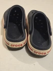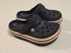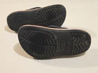The Crocs Original Classic Junior Kids Youth Size 1 J1 in Black is a unisex clog sandal designed for kids. This slip-on shoe features a low top shaft style with a round toe shape and flat heel height. It is suitable for various occasions including travel, activewear, and casual wear, making it versatile for everyday use. The shoe offers moderate cushioning and comfort, with a rubber outsole for walking, beach activities, and water sports during the summer, fall, and spring seasons. The Crocs J1 model maintains the classic theme with the signature Crocs logo and is made of synthetic lining and rubber upper material for durability.