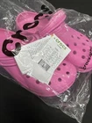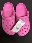 The product is a pair of Crocs in a vibrant pink color, designed for women with a US shoe size of 7 or men's size 5. These slip-on clogs feature a round toe shape, a flat heel height, and are made of rubber material with a synthetic lining for comfort. The classic style and logo accents make them perfect for casual occasions in the summer, fall, or spring seasons. These new Crocs come with tags attached, making them a stylish and comfortable choice for walking activities.
